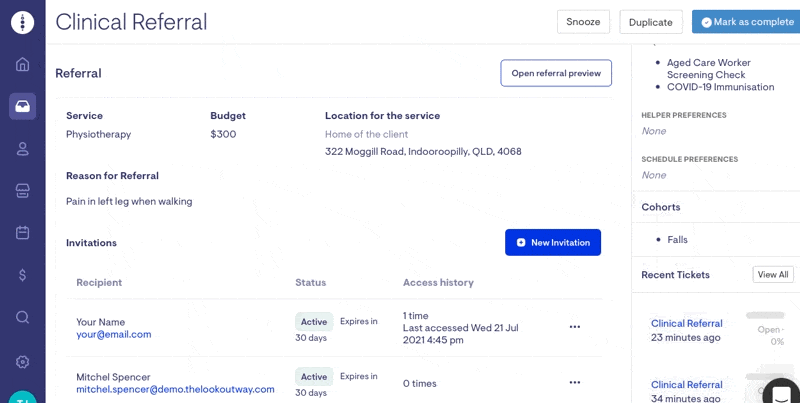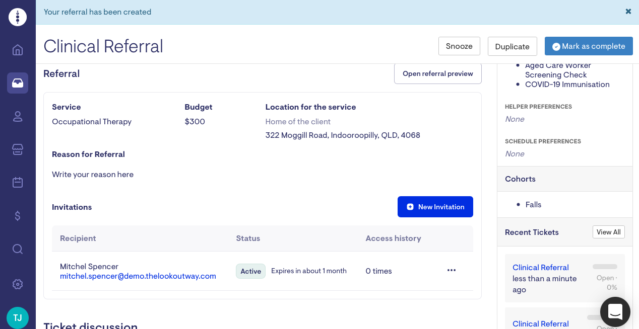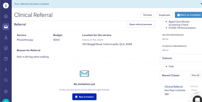 Your referral is automatically associated with a ticket that can be templated to support your organisation's workflow.