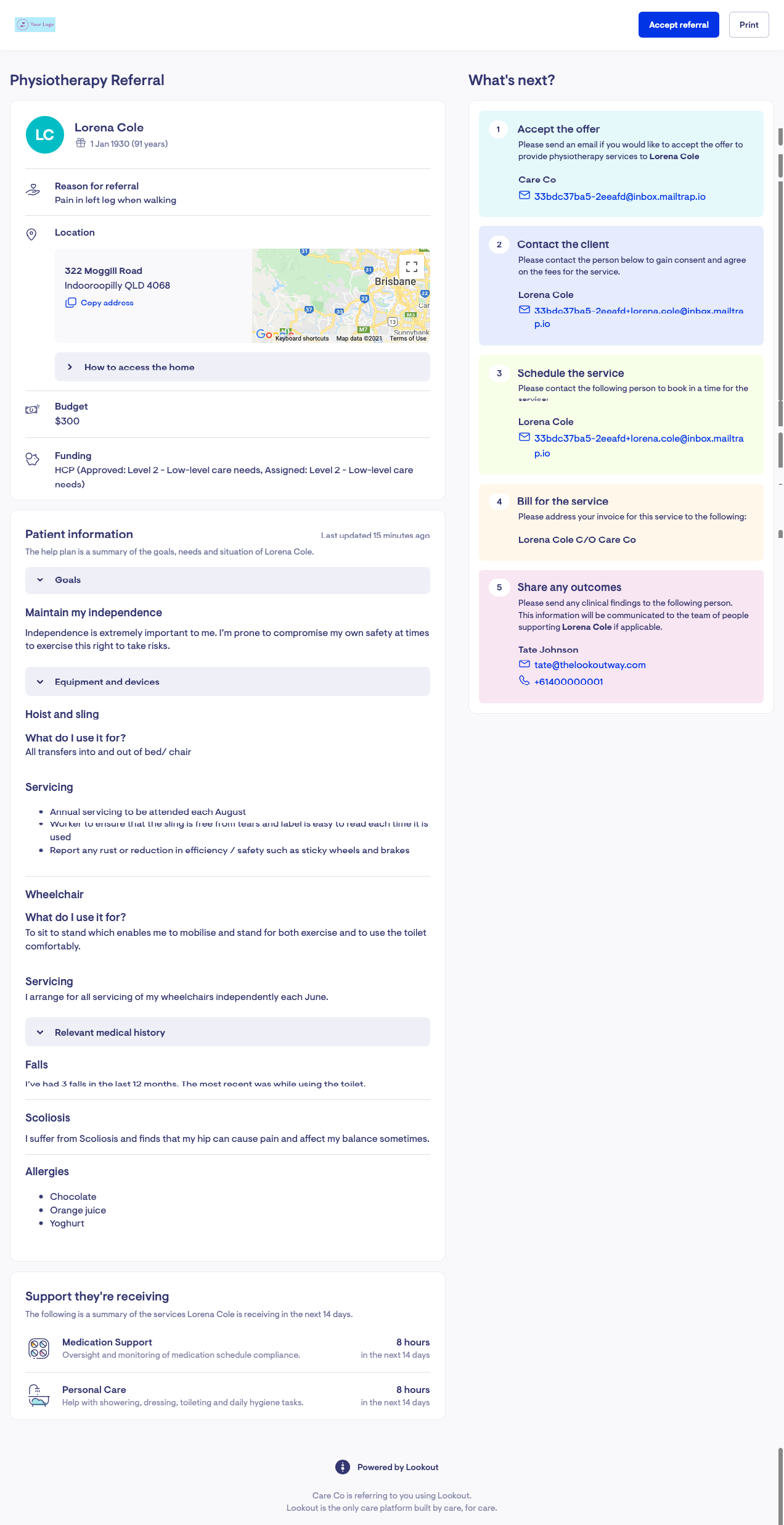 Lookout's referrals feature allows you to send quality referrals to your Allied Health network. Confidently share the most up-to-date client information easily through this safe and secure system, designed to protect privacy. The referrals feature also streamlines the referral acceptance process, making it easier for your Allied Health partners to focus more on delivering great care.