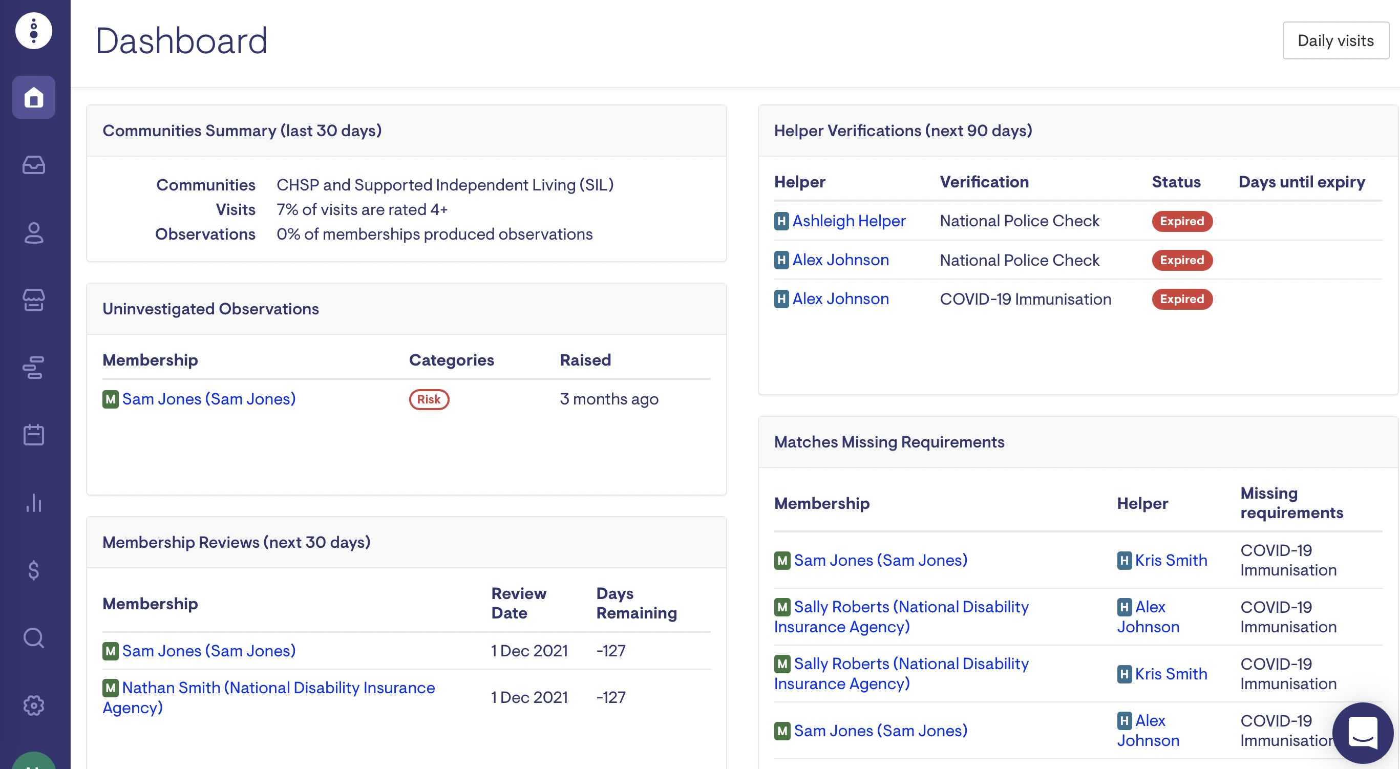 Your Dashboard is designed to help you keep Helper (Care/Support Worker) Verifications up to date and to flag Missing Requirements between Memberships and Helpers.