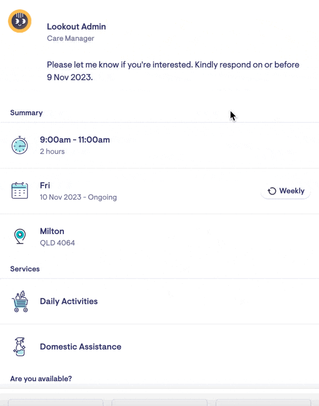 Care workers will receive a notification for a new opportunity. They can view the invite and send a response by clicking the notification.