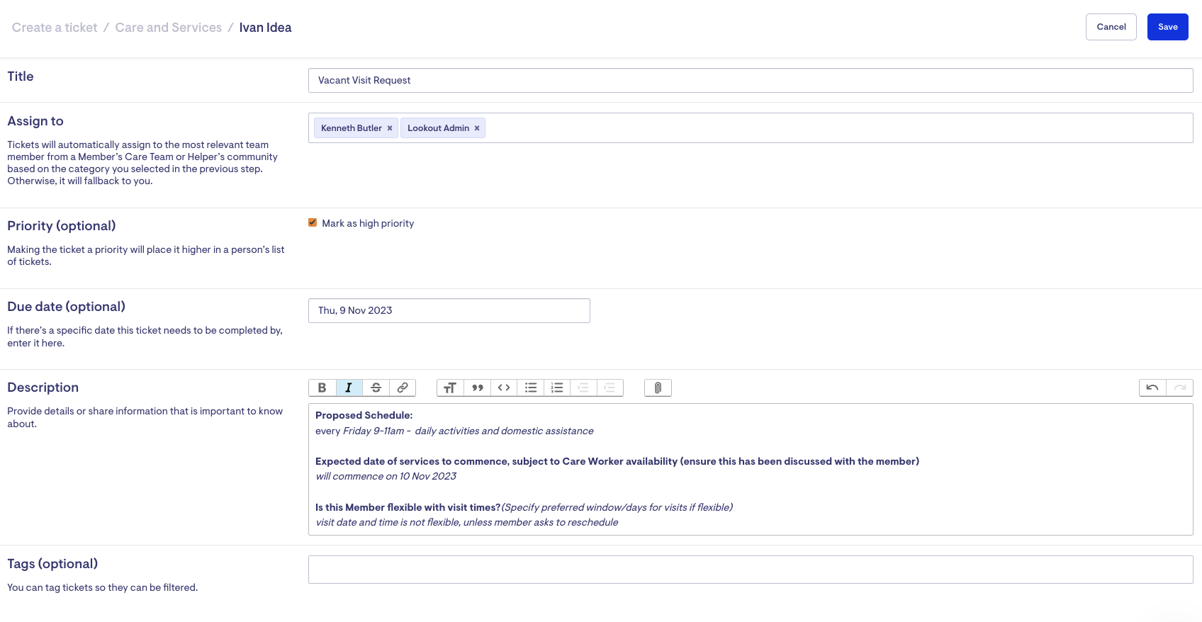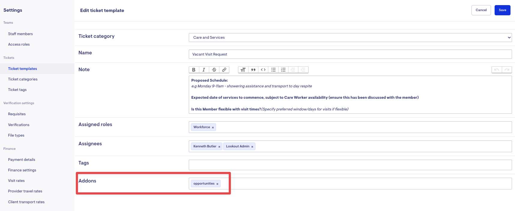 You can manage Vacant Visits and request Care Workers (Helpers) to fill the visit by using tickets. These allow you to advertise a visit or create a new match in the Administration view. Lookout allows you to: