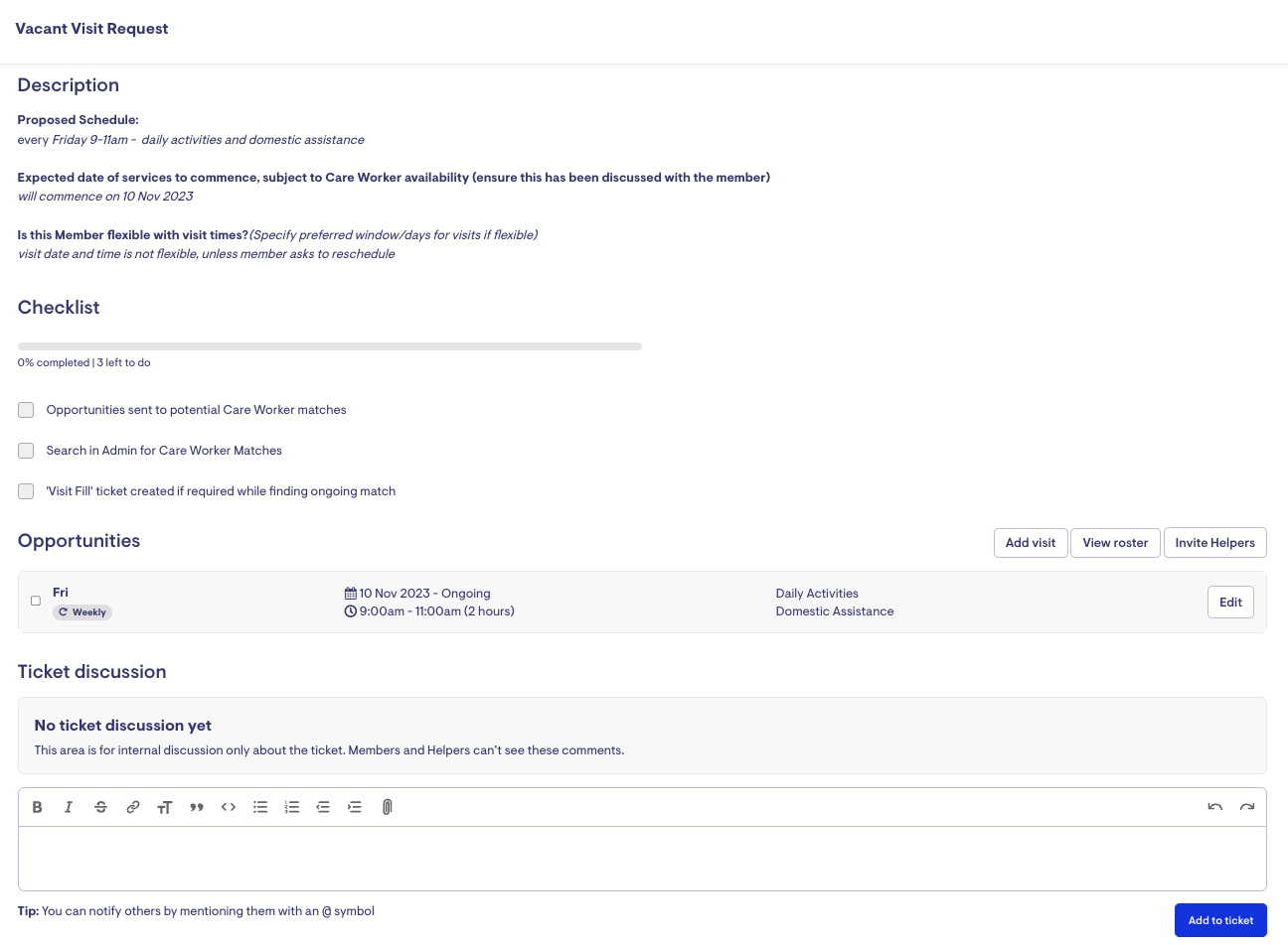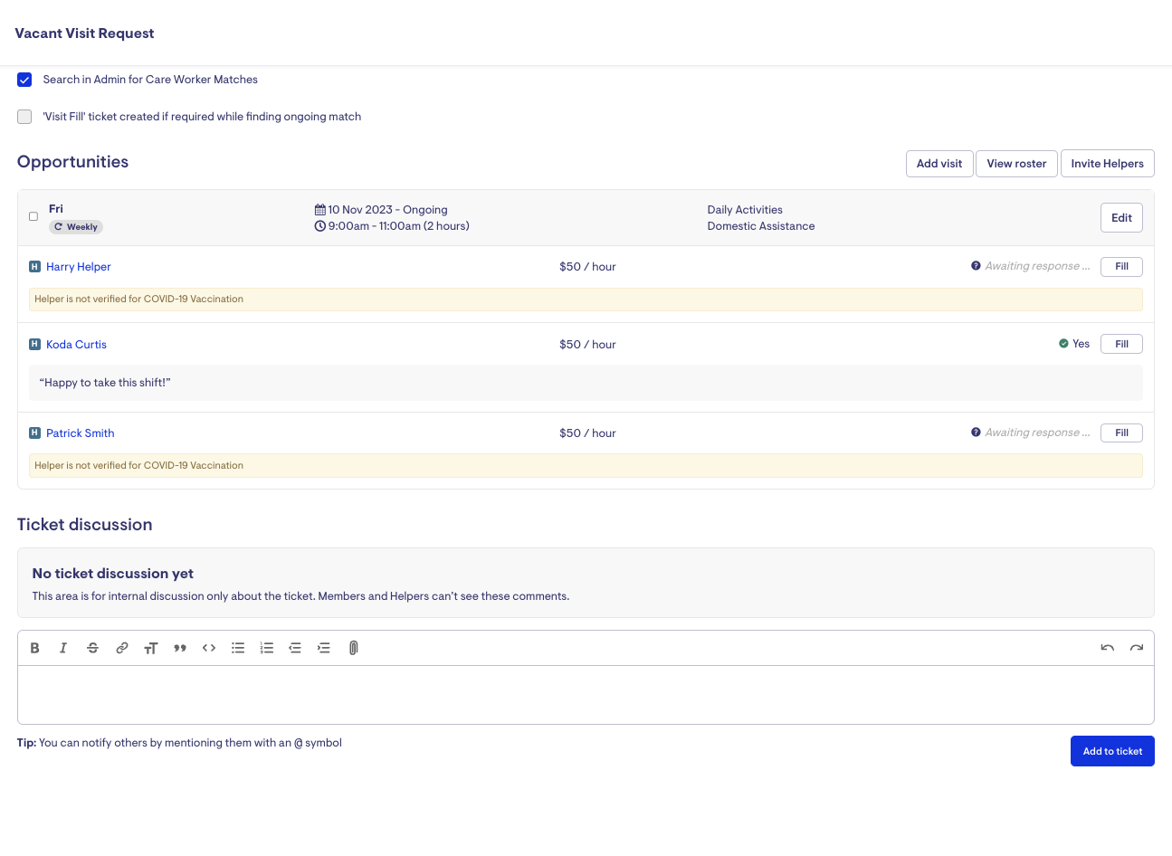 Utilising the Vacant Visit add-on in a ticket, you can invite Helpers to roster on for a visit and keep track of their responses.
