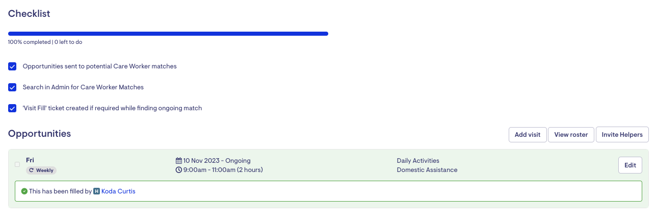 Once you've invited Helpers to the opportunity, you'll be directed back to the Helper Request ticket. You'll see a summary of the opportunities you'll be inviting Care Workers to respond to.