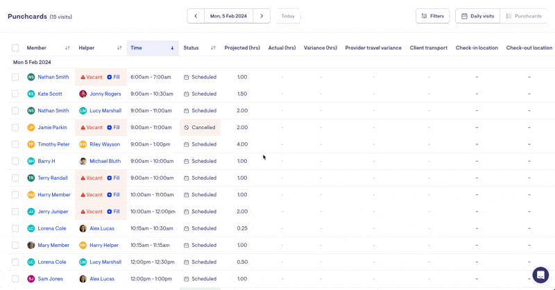 To locate all vacant visits, head to Punchcards. Use the Visit Status filter and select 'Vacant'. Because Lookout generates recurring visits for the next 90 days from today, adjust the Punchcard period to span from the current date to the next three months.