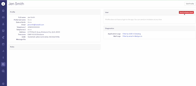Once you have created the profile, select Send Invitation Email. This will send the user an email with a link to activate their account and create a password.