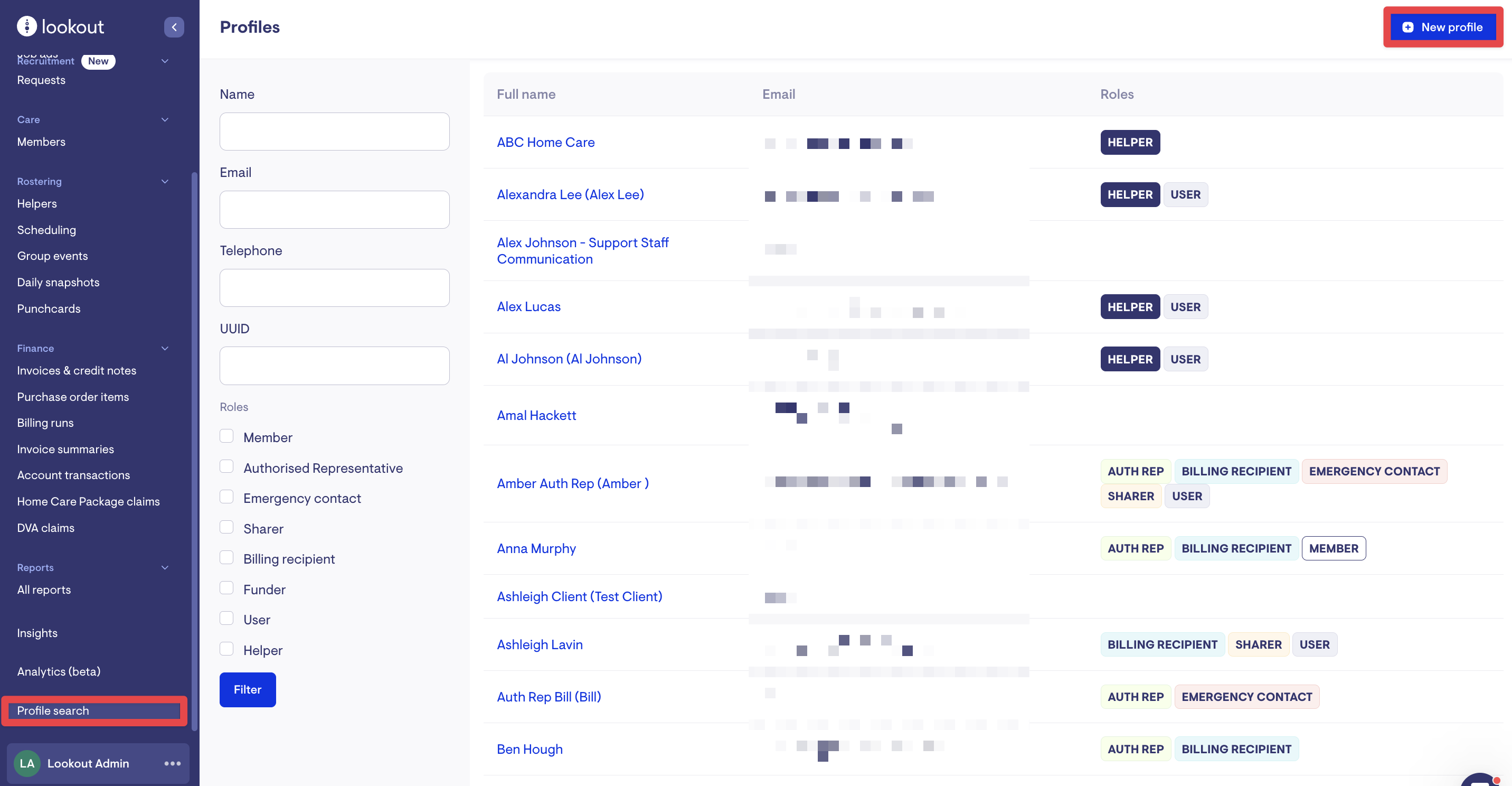 All admin staff members have access to all Memberships, user profiles and all functionality in Lookout. The exceptions are the following: