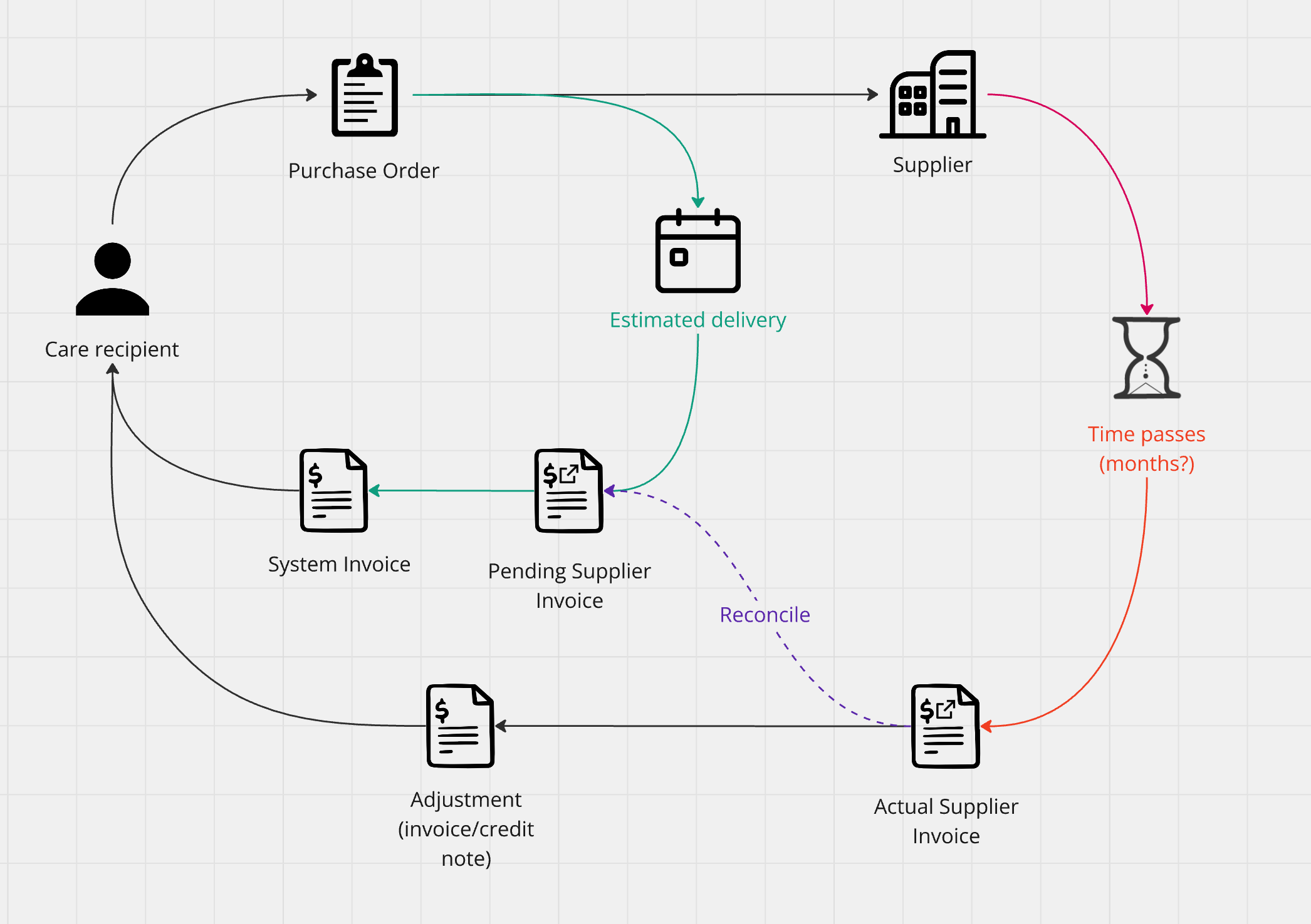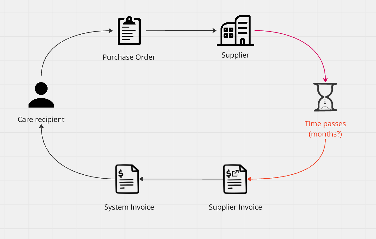 Purchase orders help manage and track purchases of goods and services for care recipients, such as one-off equipment orders or recurring weekly meals and allied health appointments from third-party providers.