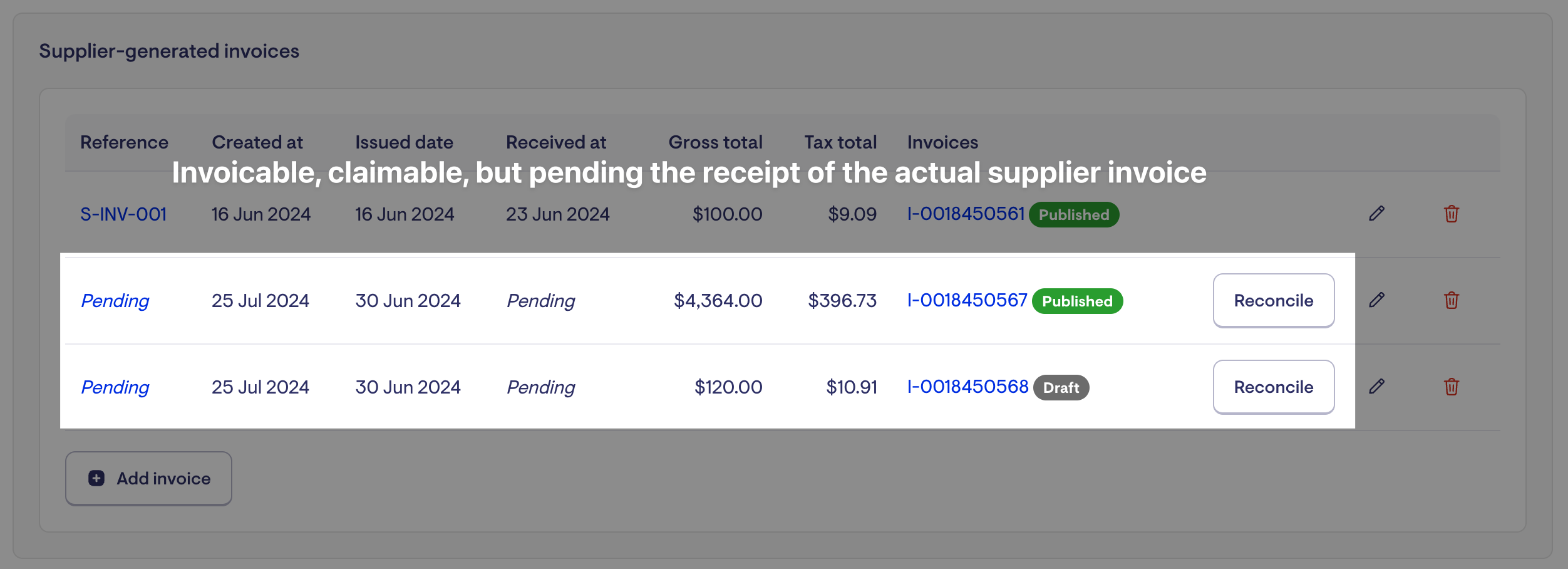 When scrolling down to the supplier-generated invoices, you will see invoices awaiting reconciliation. These items will have invoices created for them, to affect care and services balances, and ultimately be claimable.