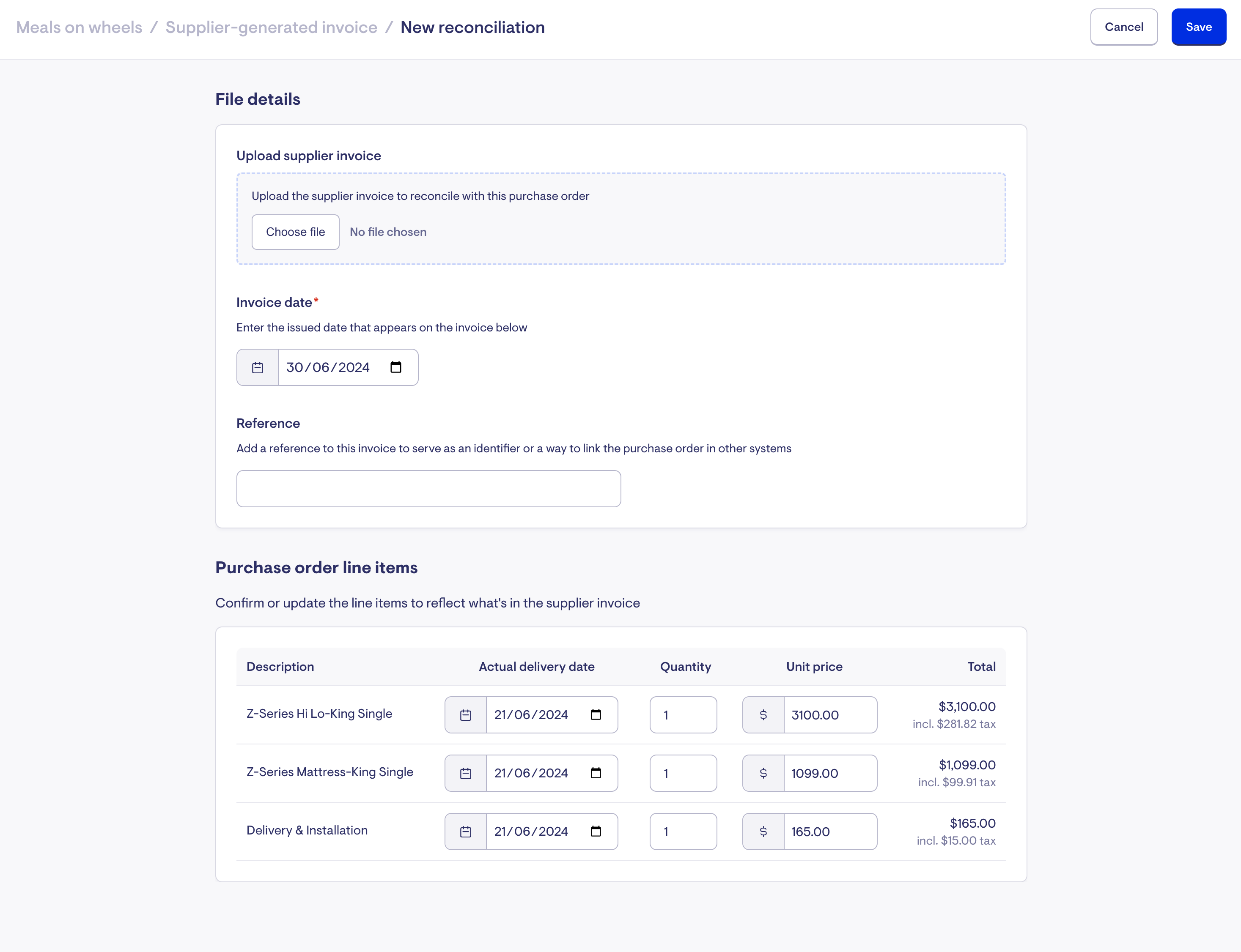 Once you receive an invoice from the third party, you can match it with the purchase order and upload it ready for the next billing and payment run.