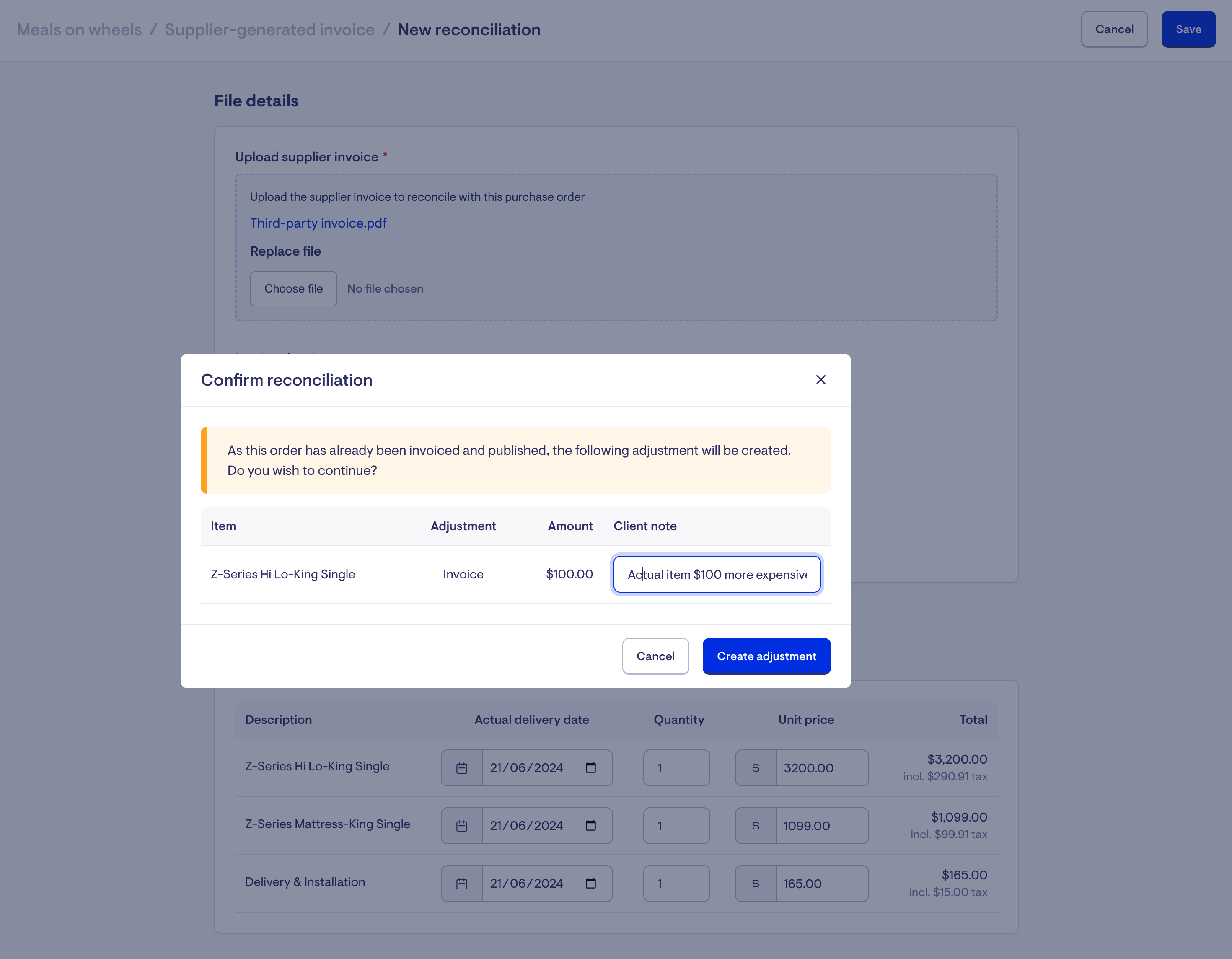 During confirmation any required adjustments become adhoc invoices or credit notes for the member, attached to the same originating supplier invoice - and published via the next billing run like any other. The can be freely edited, and manually published just like any other adhoc invoice or credit note.