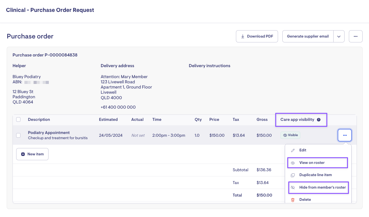 Purchase order line items can be made visible in a member's roster and displayed within the Member's care app for improved visibility.