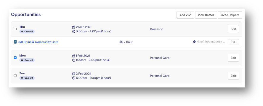 If a care worker is sick or on leave, you can quickly update their visits to vacant by using the bulk edit option. You can also cancel visits in bulk