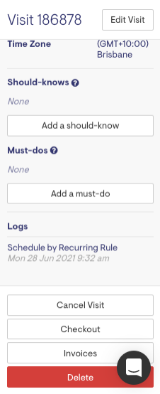 Click ‘Edit Visit’ at top right to edit or scroll to bottom and click ‘Cancel Visit’ to cancel visit.