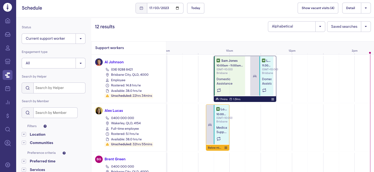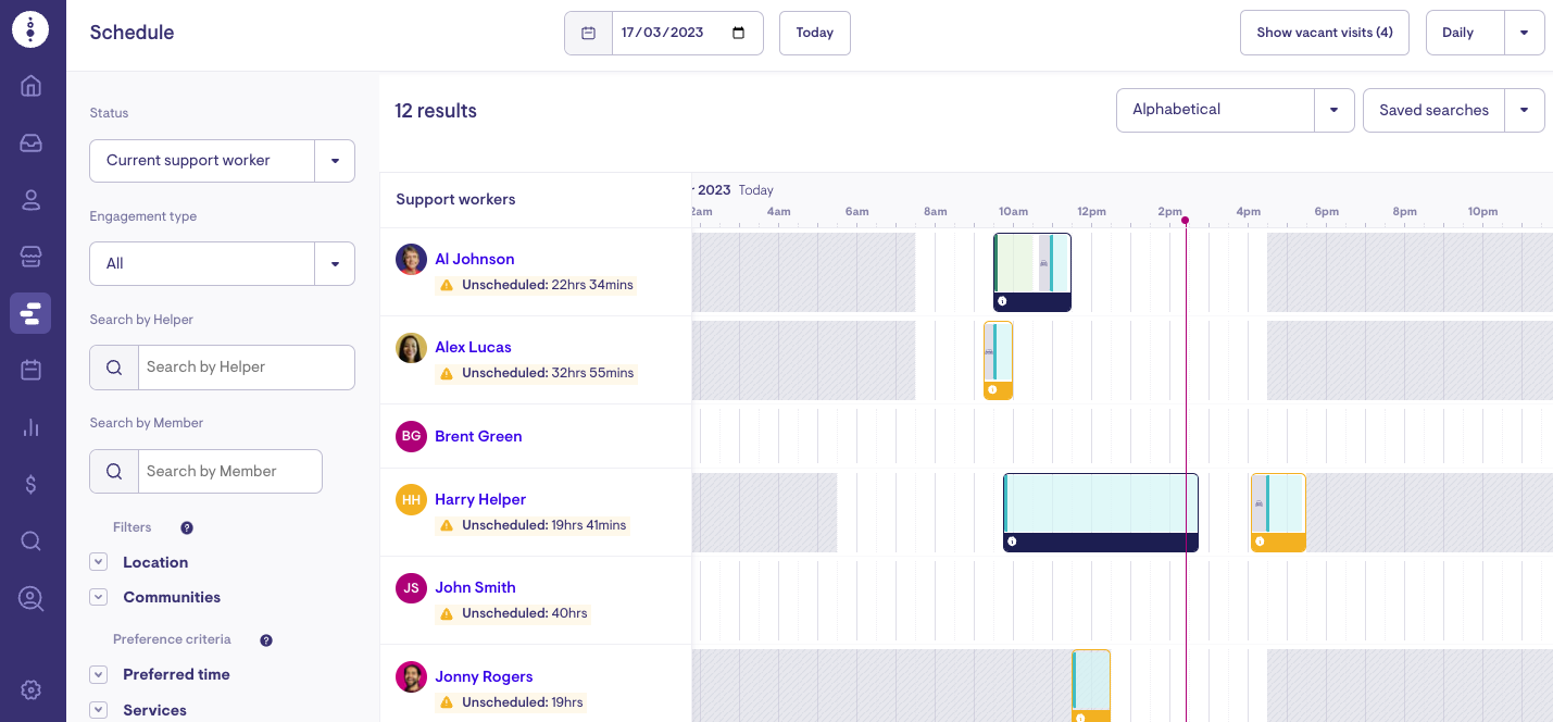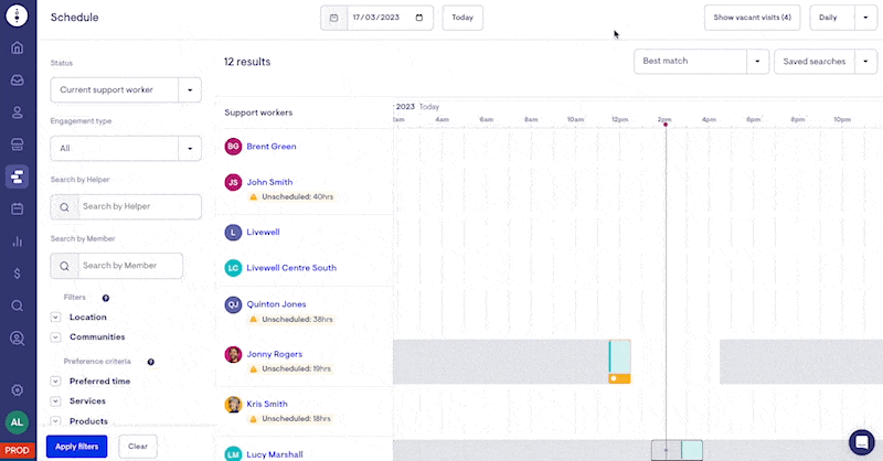Provides a Daily, Detailed (daily) or Weekly view of Care Worker availability and visits. This view can be sorted by alphabetically, shift availability, distance (nearest first), best match as well as filtered by location, communities, services and more.