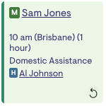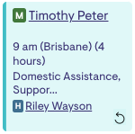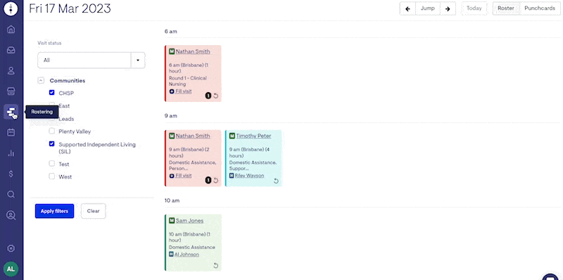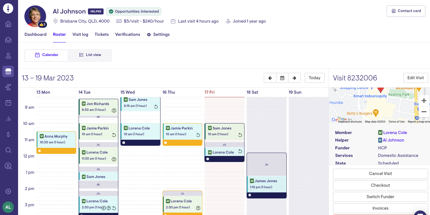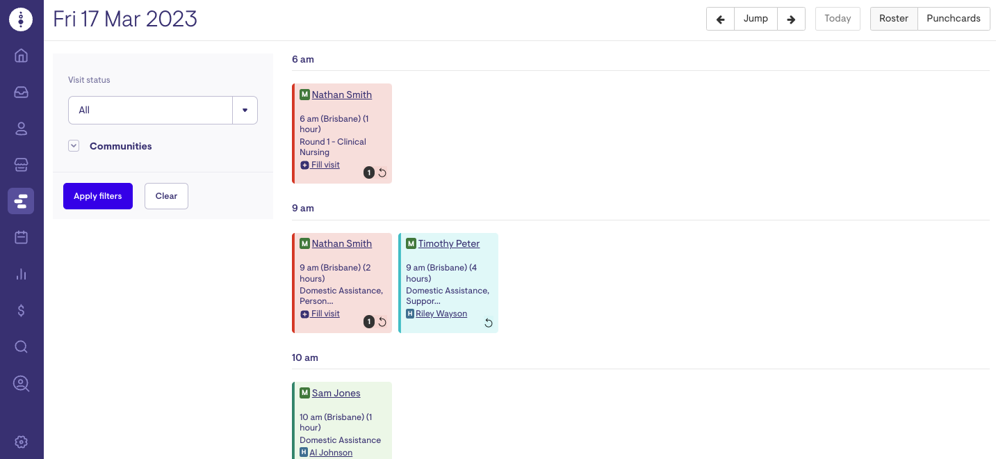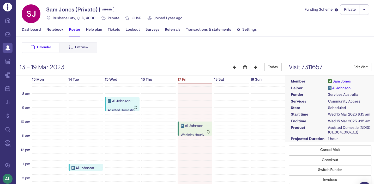 If the client has more than one Membership to support multiple funding schemes, the visit from the alternate Membership will also appear in the roster. See Managing multiple funding schemes to learn more.