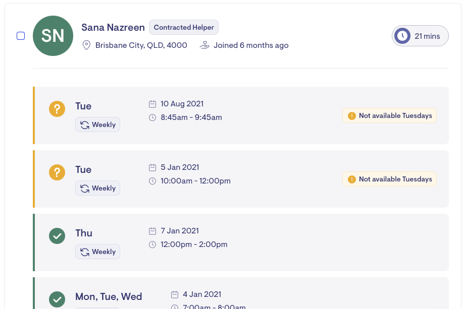 Clients using the self-managed features can see the availability of the support workers they are matched with. The system will only offer self-managed opportunities to support workers who have indicated they are interested in being contacted for that type of opportunity.