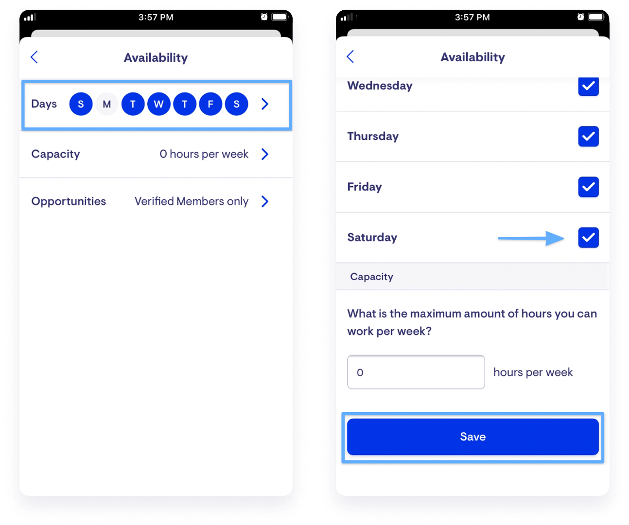 In the support workers app, tap the profile menu in the top left (where the profile picture shows), then tap the Availability menu item. Then tap the Capacity menu item and scroll to the bottom of the page to see the Capacity section. Add the maximum amount of hours per week and then tap Save at the bottom of the view.