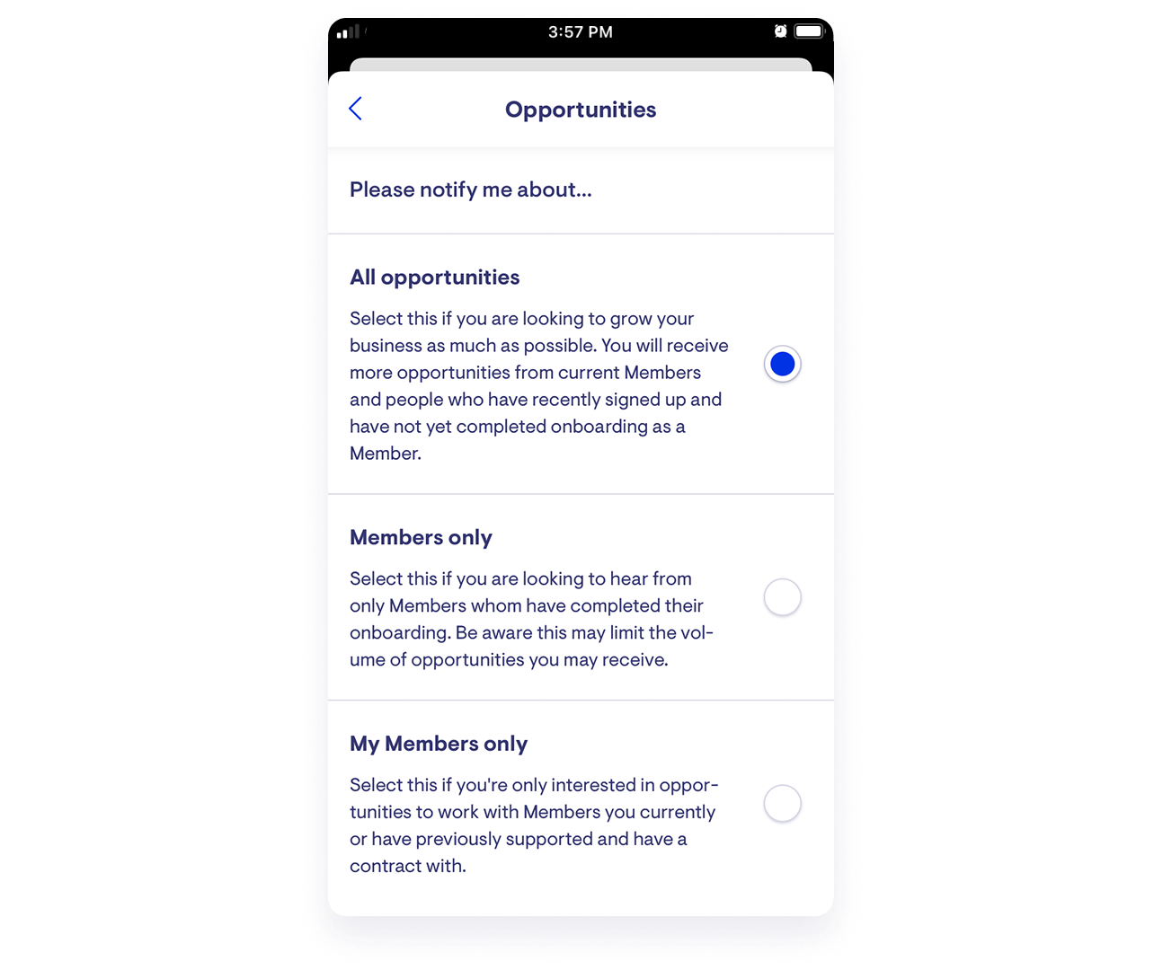 All opportunities – Select this if you are looking to grow your business as much as possible. You will receive more opportunities from current Members and people who have recently signed up and have not yet completed onboarding as a Member.