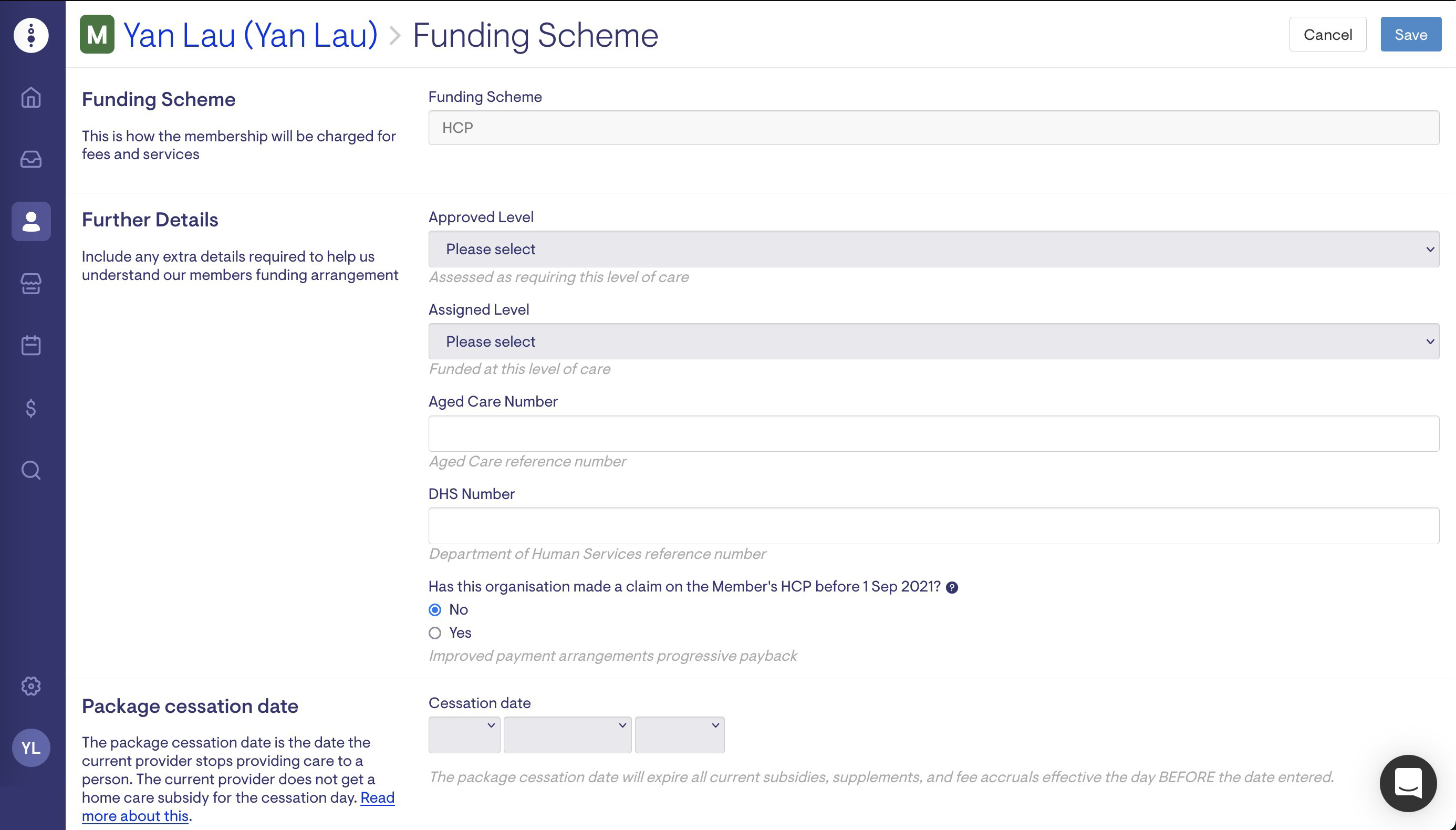 Select "HCP" from the dropdown menu of the funding scheme form and click "Save". Then fill out the client HCP "further details".