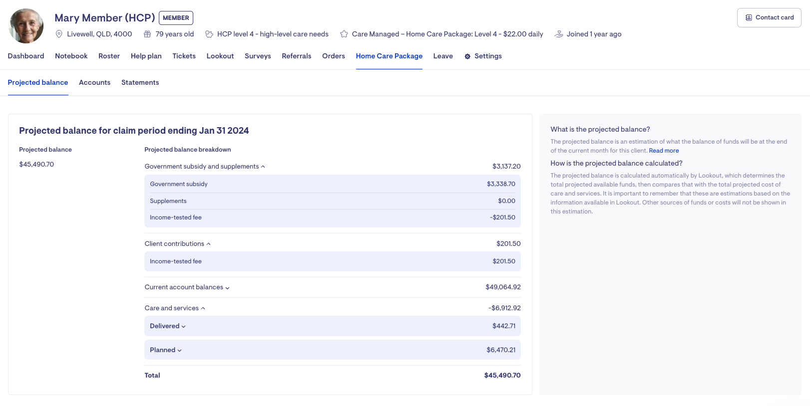 Lookout calculates the projected balance by working out the total projected available funds, then comparing that with the total projected cost of care and services. It is important to remember that these are estimations based on the information available in Lookout. Other sources of funds or costs will not be shown in this estimation.