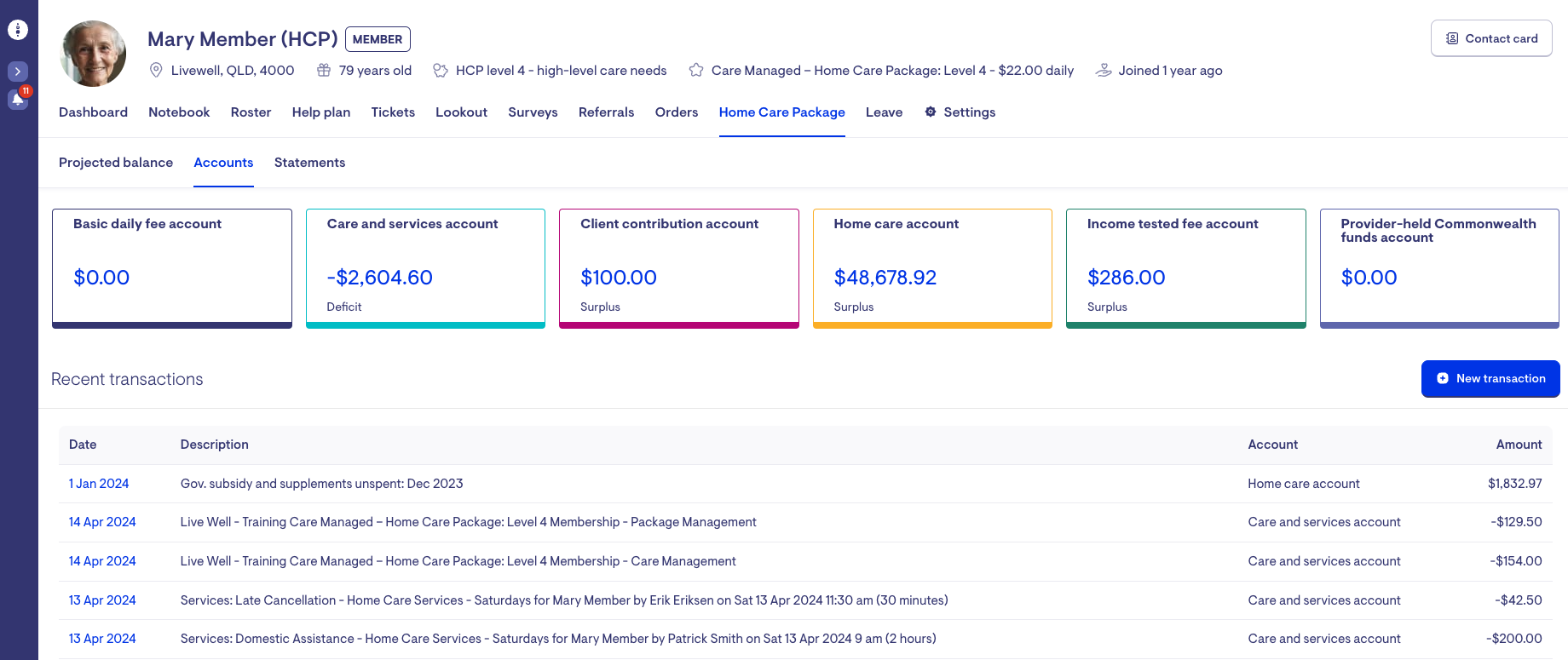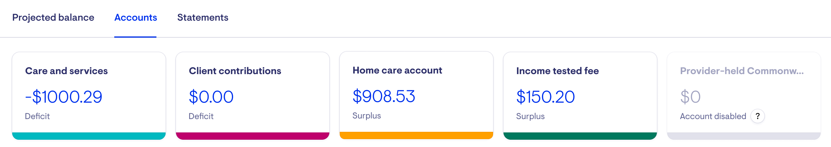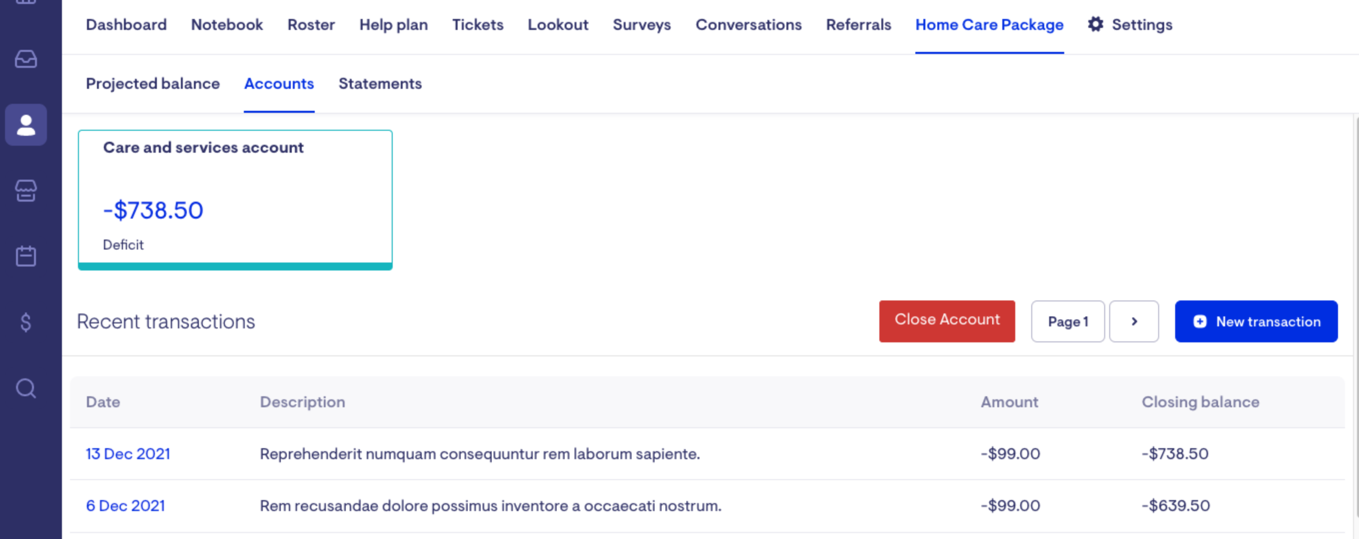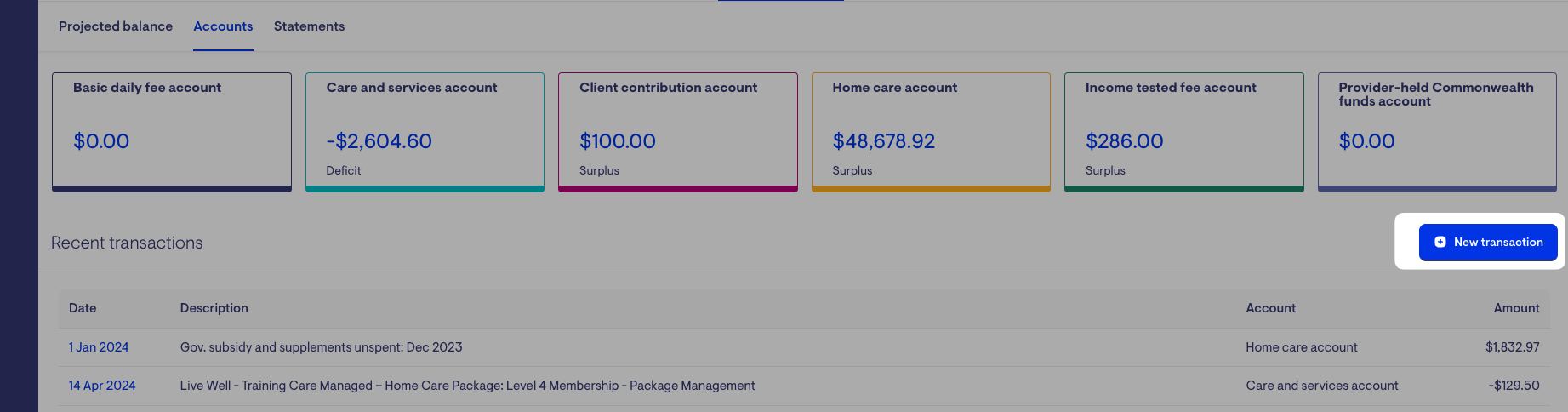 The accounts sub-tab provides an overview of the different financial accounts affiliated with the client's home care package and a summary list of recent transactions across all of the accounts.