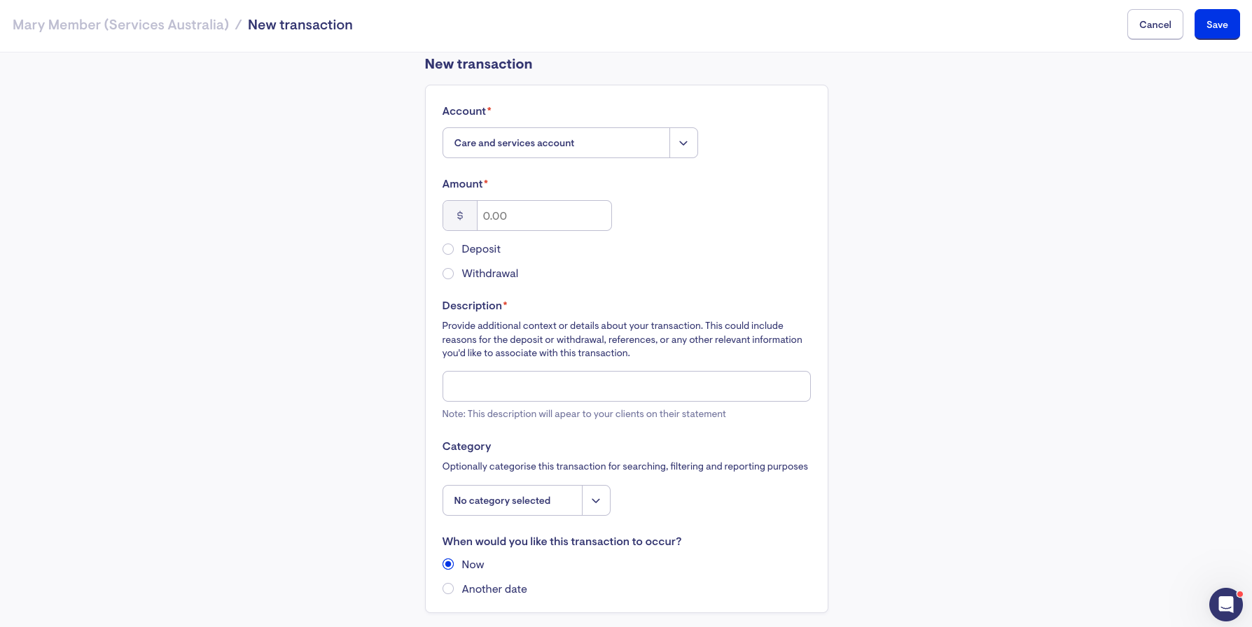 Any transactions resulting from finalising a monthly claim in Lookout which affect this account will be generated automatically. Any additional transactions you wish to apply to this account must be created manually. This includes any adjustments advised by Services Australia, including through the monthly payment summary, such as: