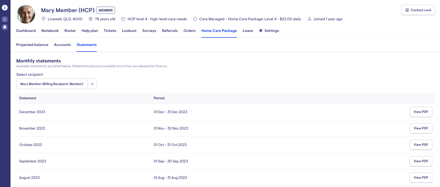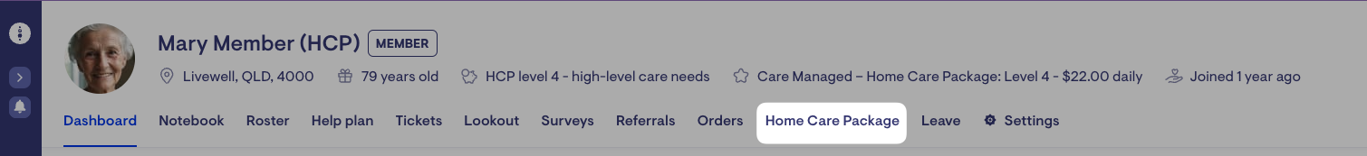 The Home Care Package tab is the place in a Membership where financial information related to a client's Home Care Package lives.