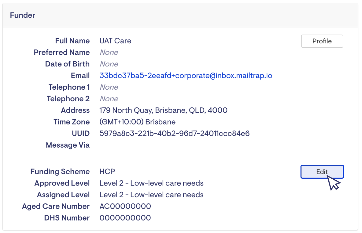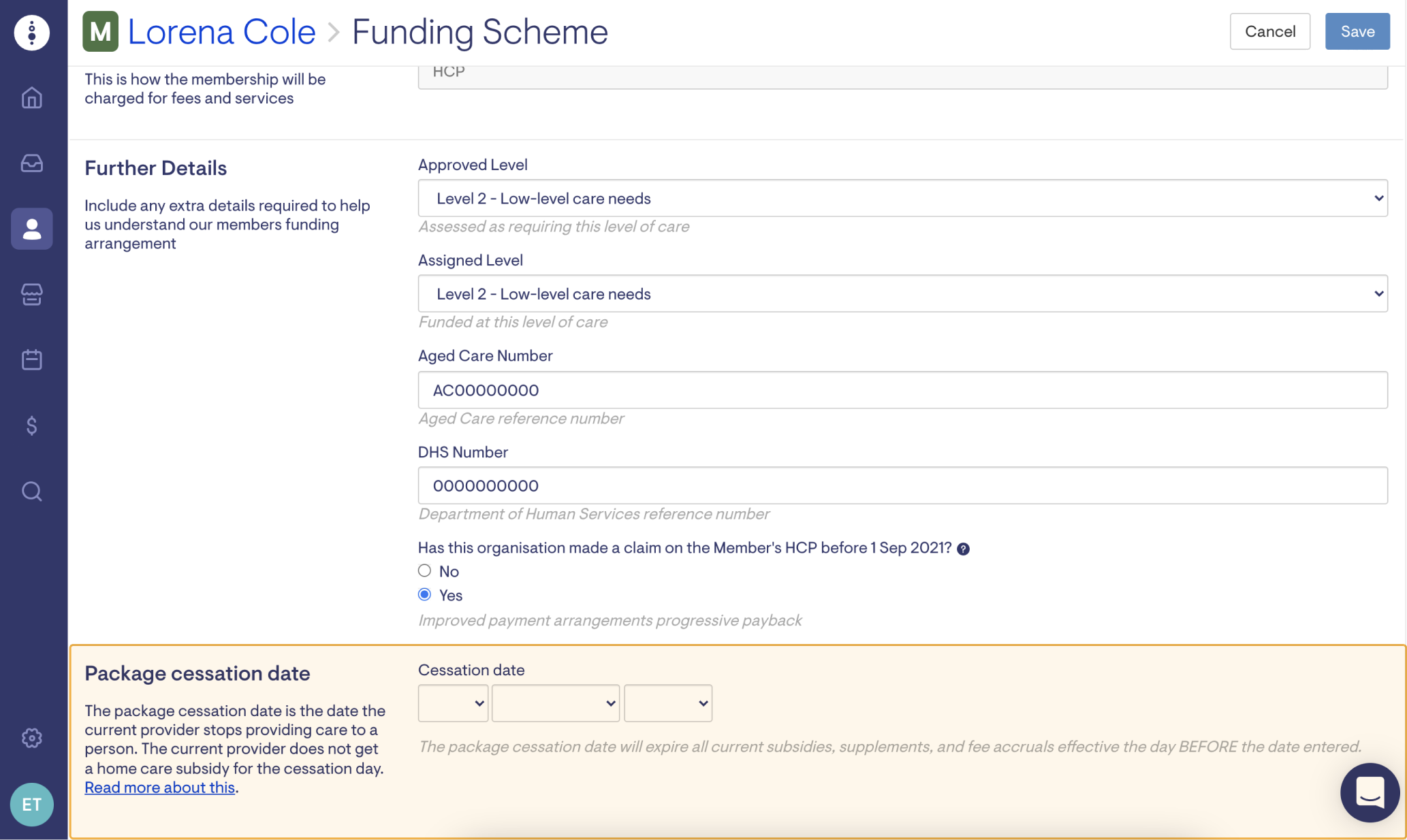 This will take you to a page where you can edit the client's funding scheme. At the bottom of the page, you'll find an area where you can enter the package cessation date.