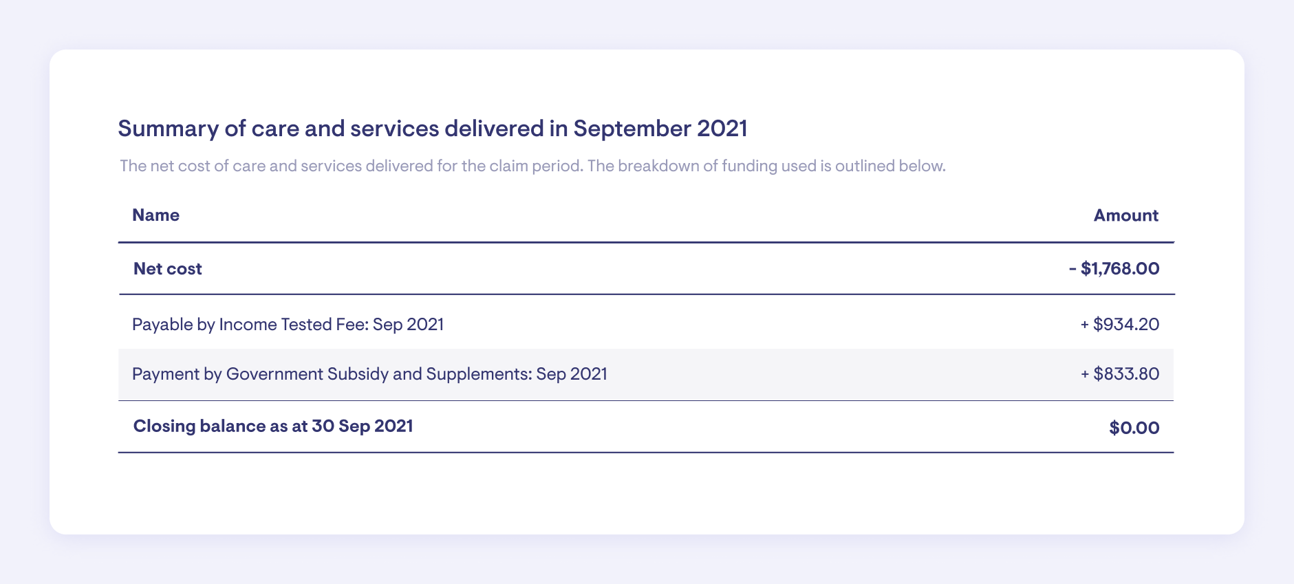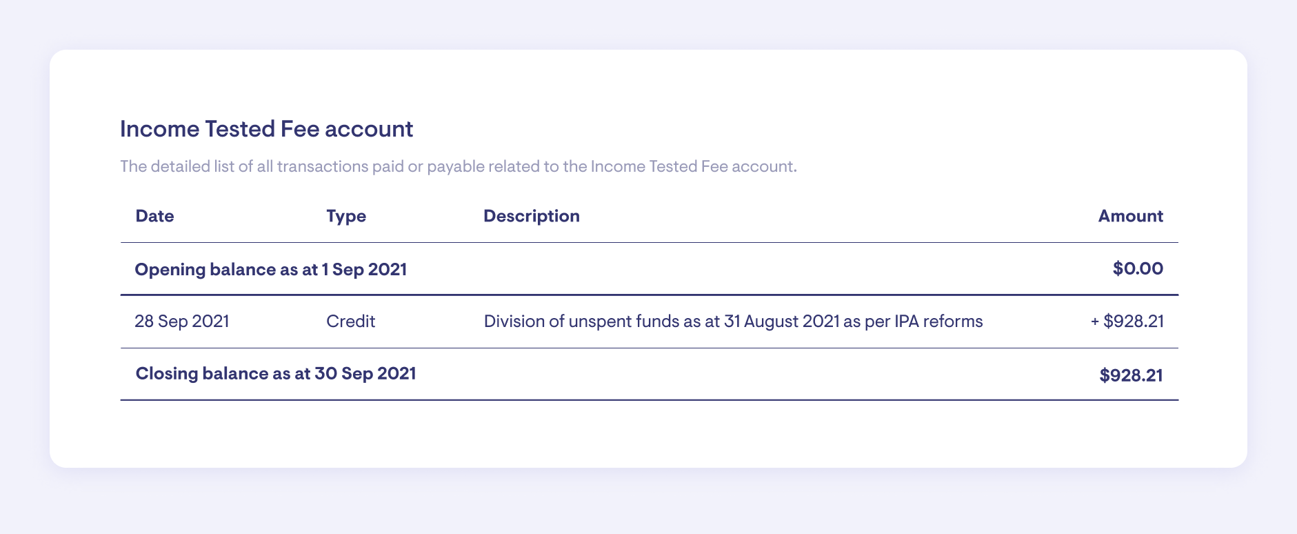 Any accrued unspent funds collected from Income Tested Fees are held by your care provider for you until you need them. If a change is made to your assessed Income Tested Fee and results in an adjustment to your Income Tested Fee balance, the adjustment will be shown here.