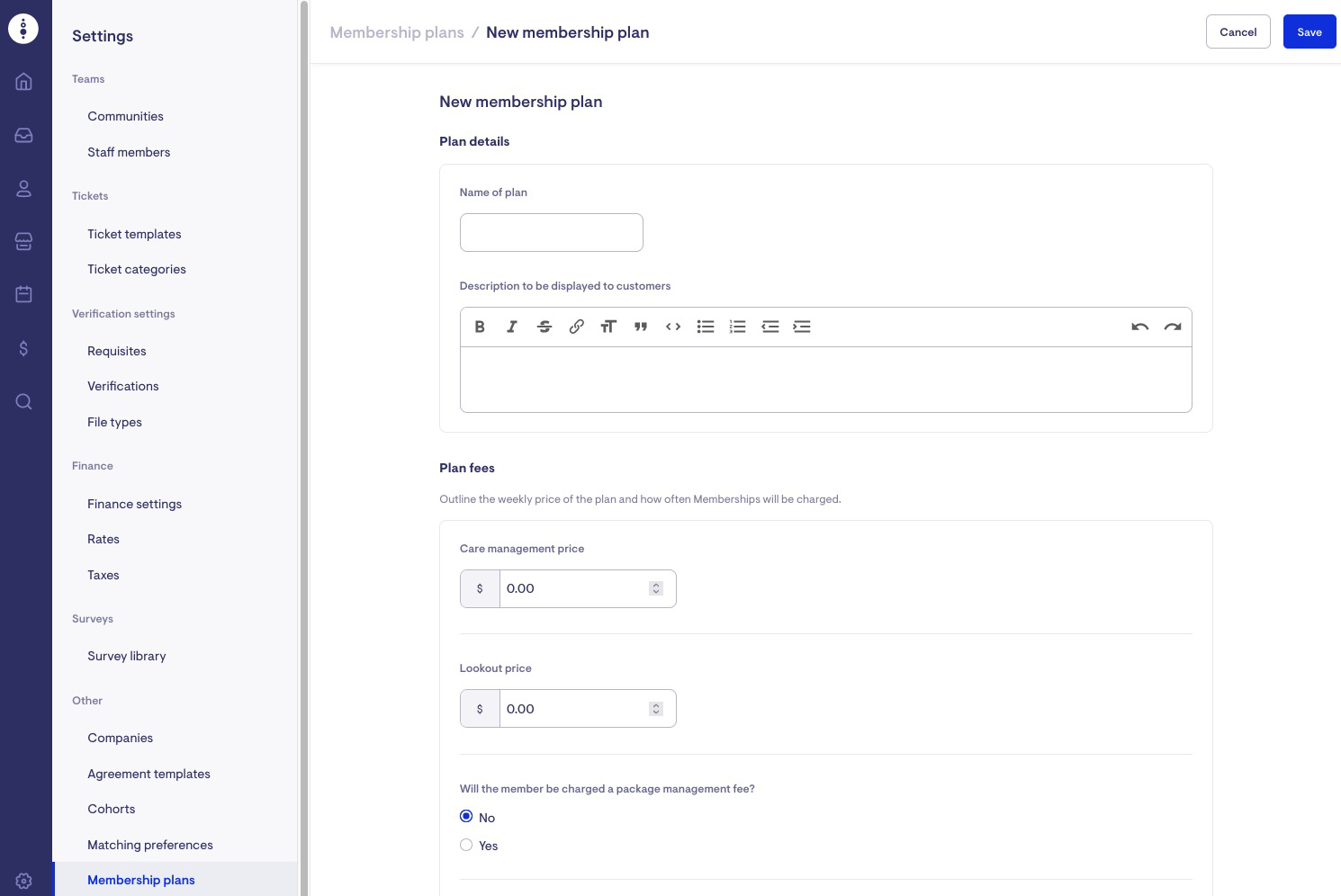 For membership plans that charge members a care management price, add the weekly price under care management. This will generate a weekly invoice with this amount for clients that are on this membership plan. If there is no care management price for the plan, set the price to $0.