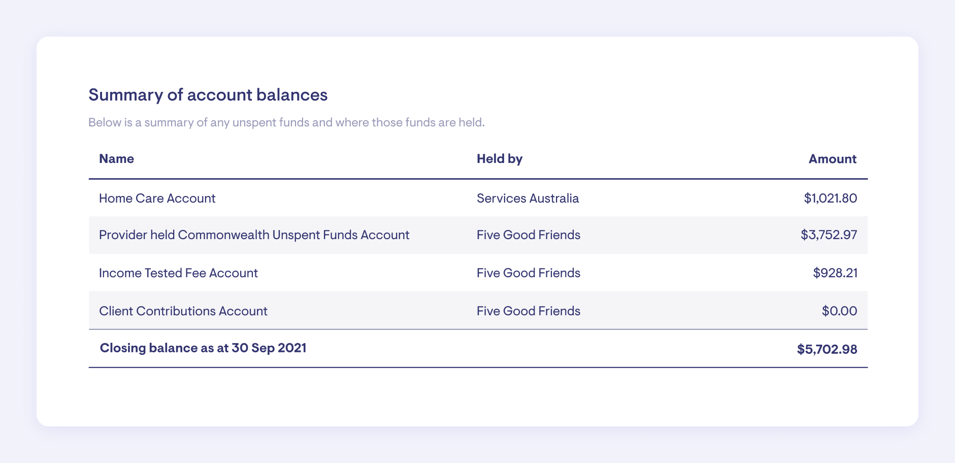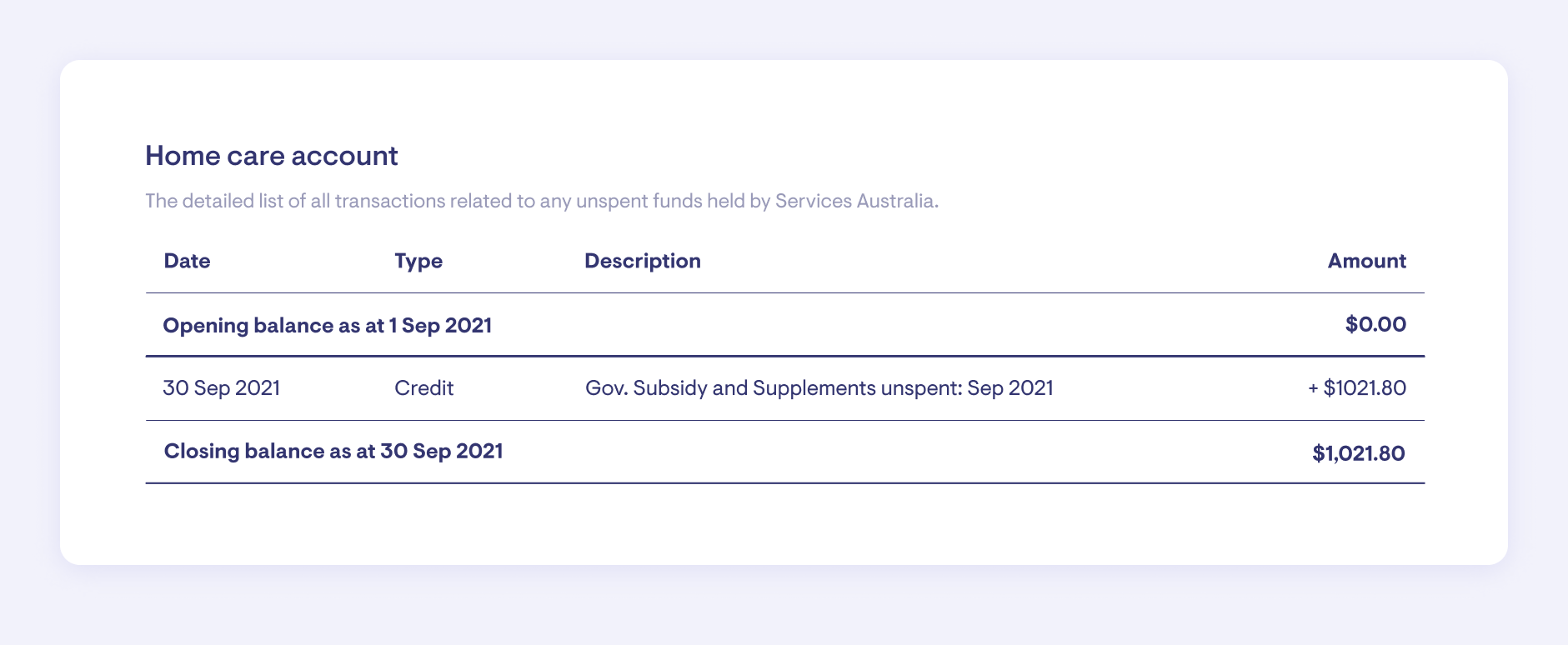 Services Australia manages a Home Care Account on your behalf. Any unspent funds from your Home Care Package entitlement accrued from 1 September 2021 on are held by the Government in this account for you until you need them.