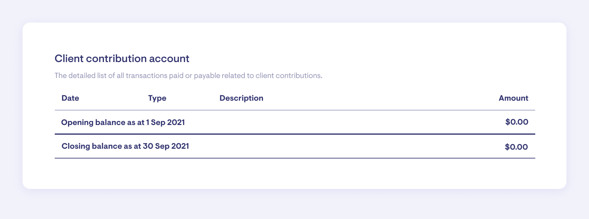 Client Contributions Account— Your provider manages an account on your behalf related to client contributions. Client contributions can include an amount you have agreed to pay above your Home Care Package entitlement, for example.