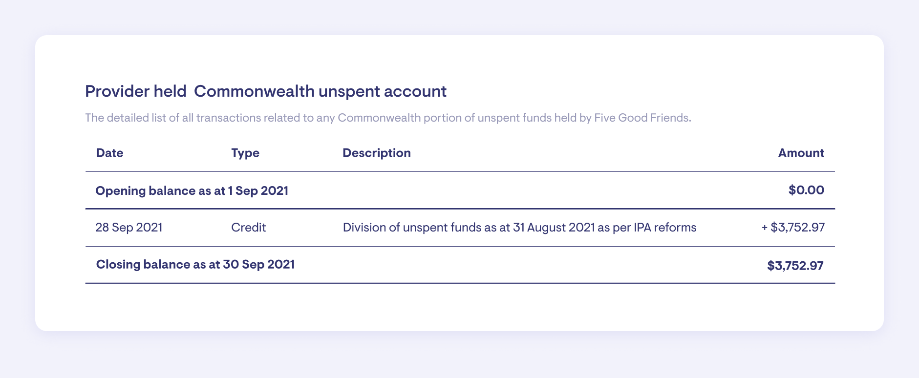 Provider held Commonwealth Unspent Funds Account: unspent Commonwealth funds held by your provider on your behalf.