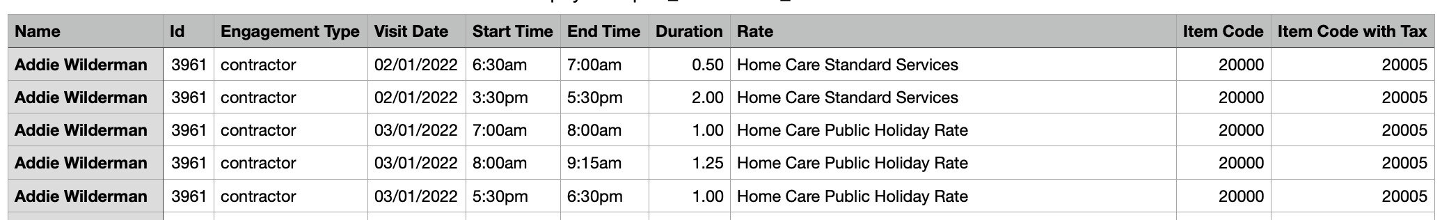 The generated report will show all visits attended by support workers along with information about the visit rate, the support worker's engagement type (contractor or employee), as well as the start and end visit times and visit duration.