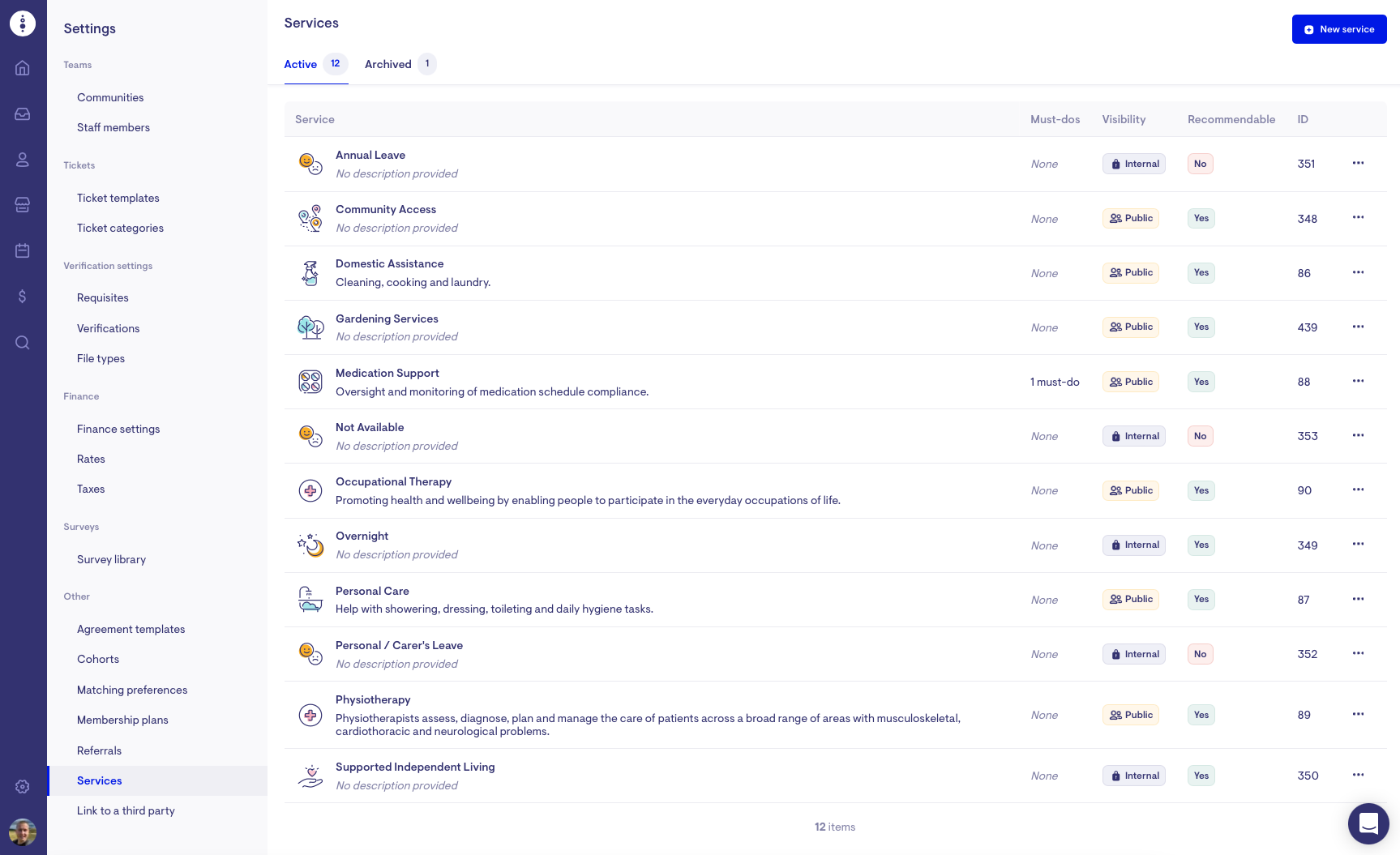 Services in Lookout are the different types of service you provide members. Examples might be 'Domestic Assistance', 'Medication Support', 'Physiotherapy', 'Personal Care' or 'Gardening Service'.