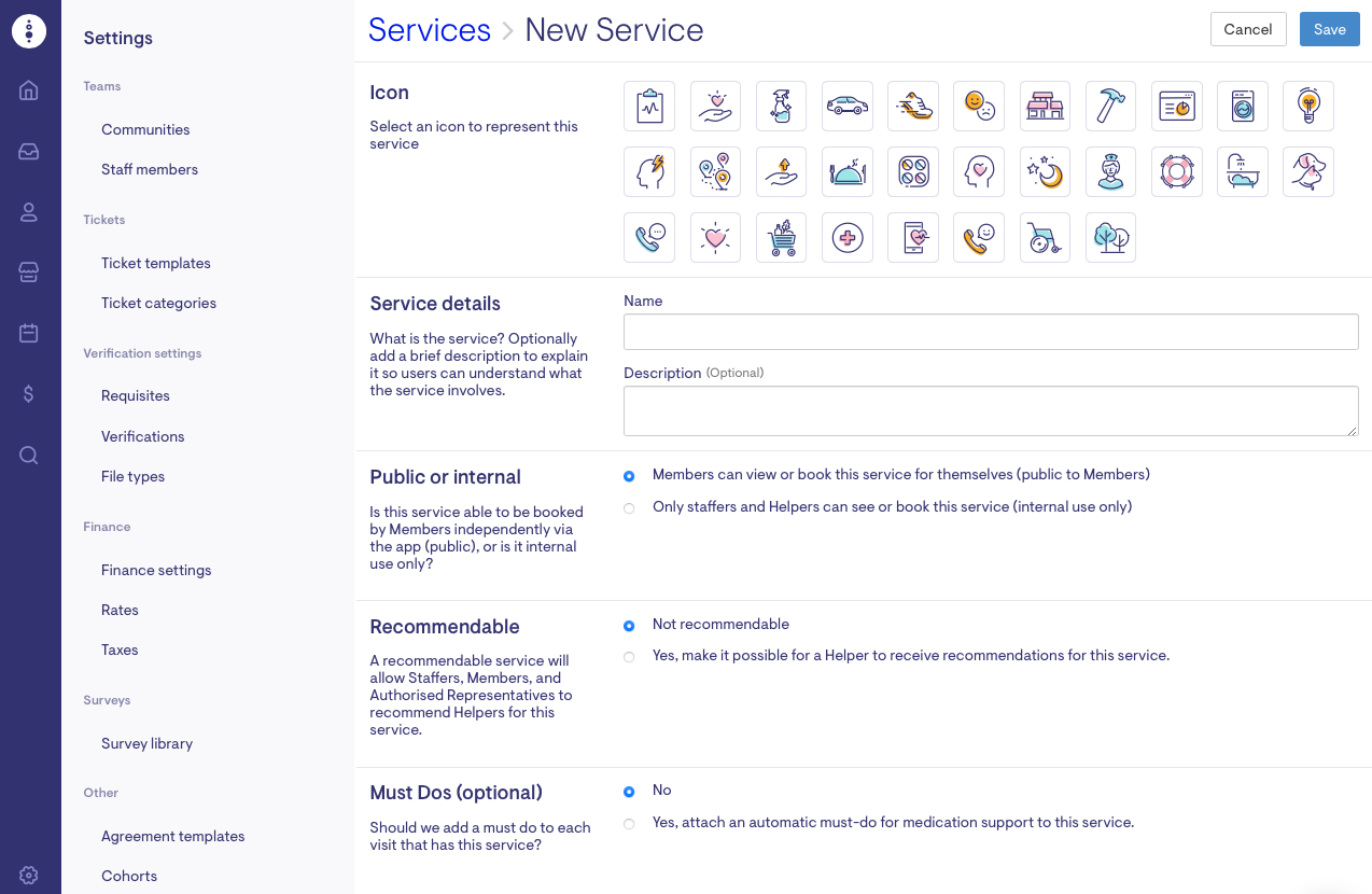 What is the service? Select an icon to represent the service and a name. Optionally add a brief description to explain it so users can understand what the service involves.