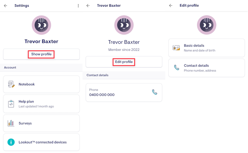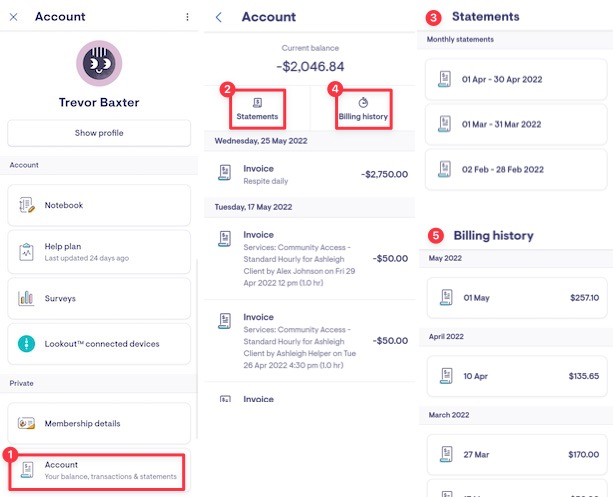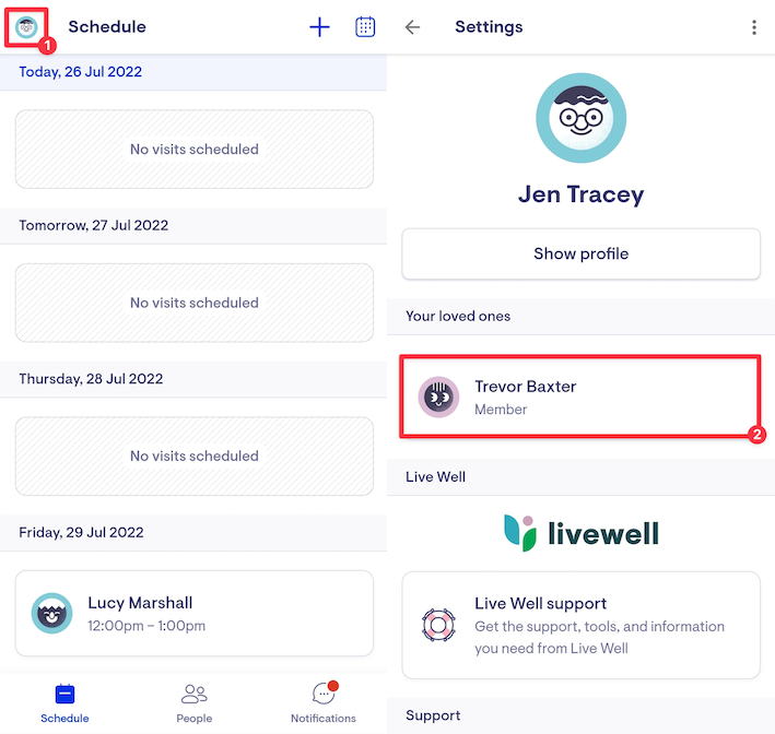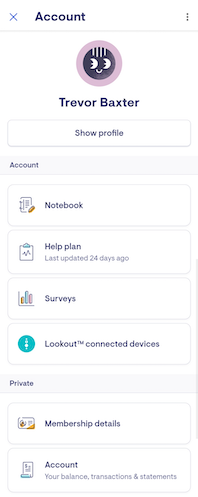 To view your or your loved ones account information, such as the Notebook, Help Plan and Transactions and Statements, select the avatar icon in the App's top-left corner.