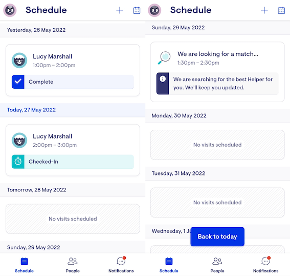 The schedule highlights when a Helper has arrived. For your peace of mind, visits can be seen as in progress (viewed as Checked-in) or Complete with the time the Helper was in the home.