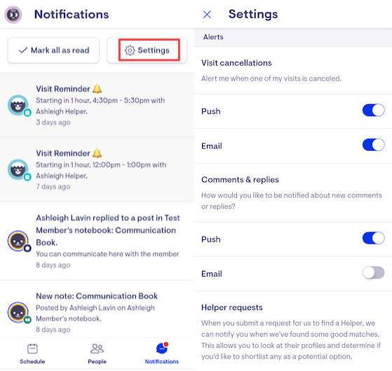 Visit reminders can be pushed to the app or emailed with a toggle button option