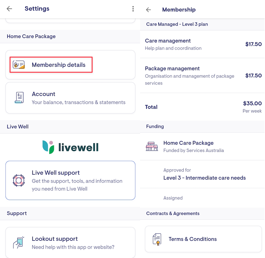 The Membership section will provide details on current funding, care and package management fees and any contracts and agreements.