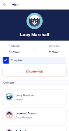 Selecting a Visit will provide more details of the visit, including an option to Dispute the Visit, Contact the Helper or your Care Team, as well as the Rate and the Services provided.