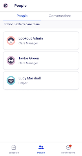 The People tab details the care team supporting you or your loved one. If you select one of the Care Team, you can view their contact details, bio and verified information. By choosing the Conversations tab, you can view and send comments to your Helpers.