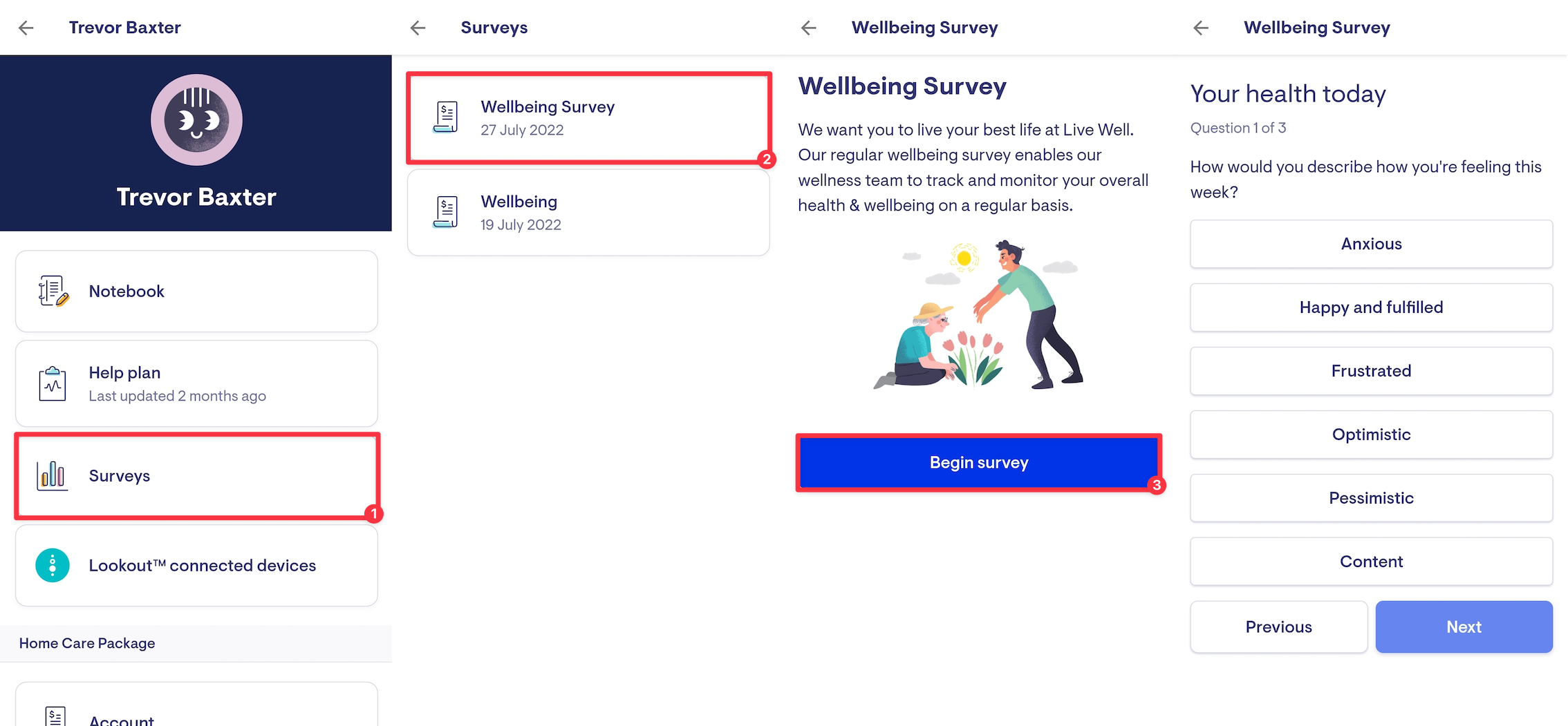 Regular surveys on health, mobility and mental state can be sent from your provider. Reminders to complete the survey are posted in the notifications section of the App and the surveys can be accessed through the Surveys listing.