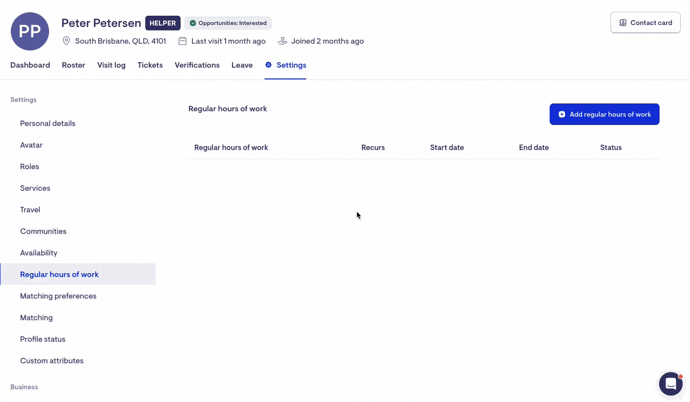 To add regular work hours to a worker's roster in Lookout, navigate to the worker's Helper profile via Marketplace. Then, you can go to Settings within the Helper profile. Once on the settings page, navigate to Regular hours of work. Any existing availability rules for the worker will appear here.