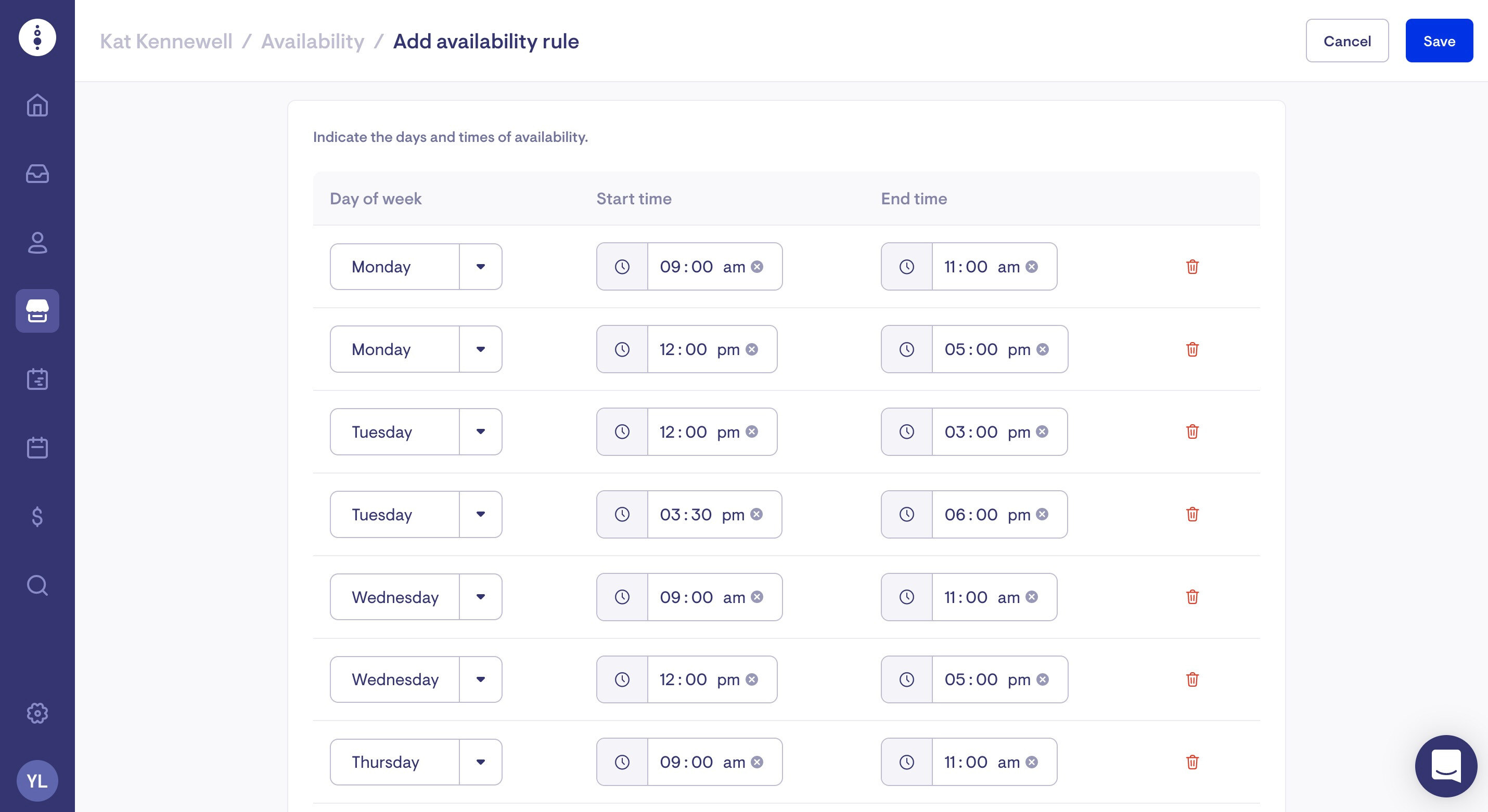 Enter the days and times that the worker is available. You can add multiple times on the same day.