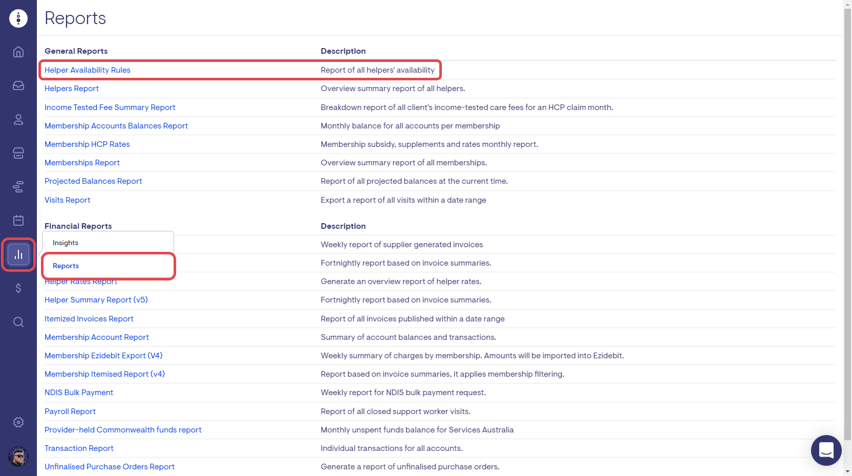 To generate an availability report, navigate to Reports via the Reporting tab and select Helper Availability Rules.