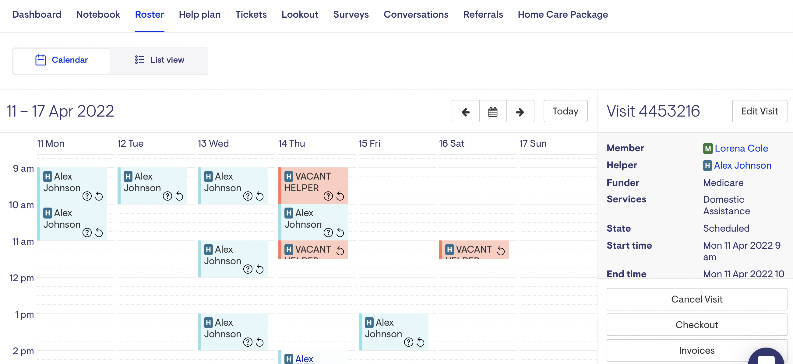 The Members Roster will enable you to view all visits in a week scheduled for a particular Member, as well as the ability to edit and add new visits.