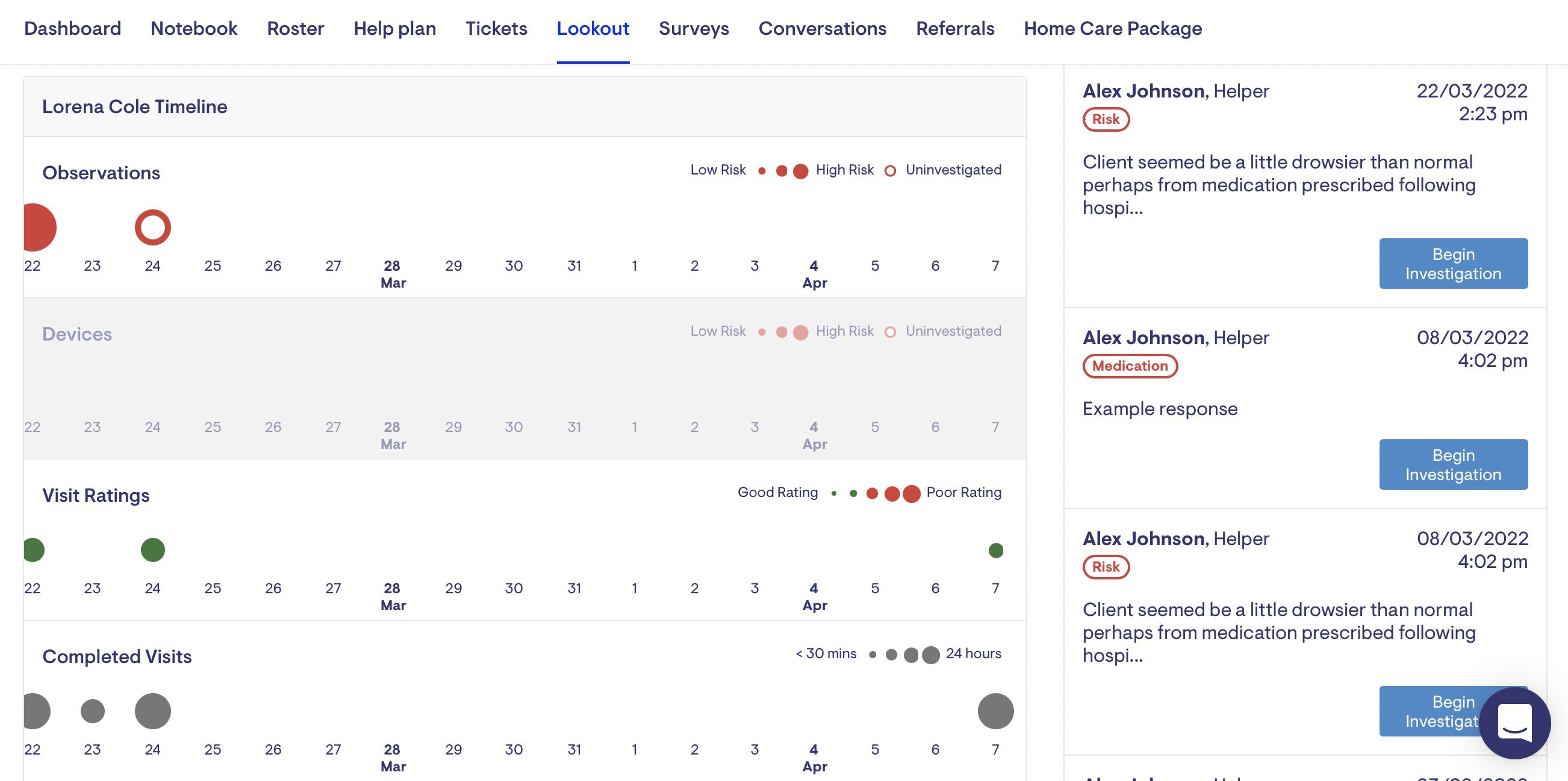 Lookout Remote Care Monitoring identifies trends and consolidates observational data from a member’s team of Helpers and external data sources – allowing your business to focus on the most important issues for each member, with a full history, every day.