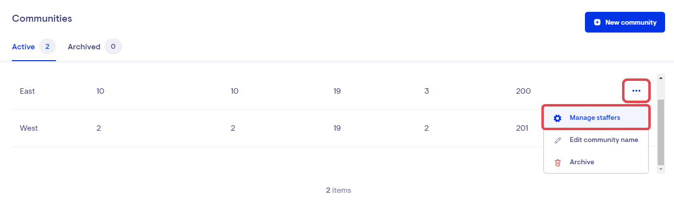 Select the more options menu (▪▪▪) next to the desired community and then select Manage staffers.