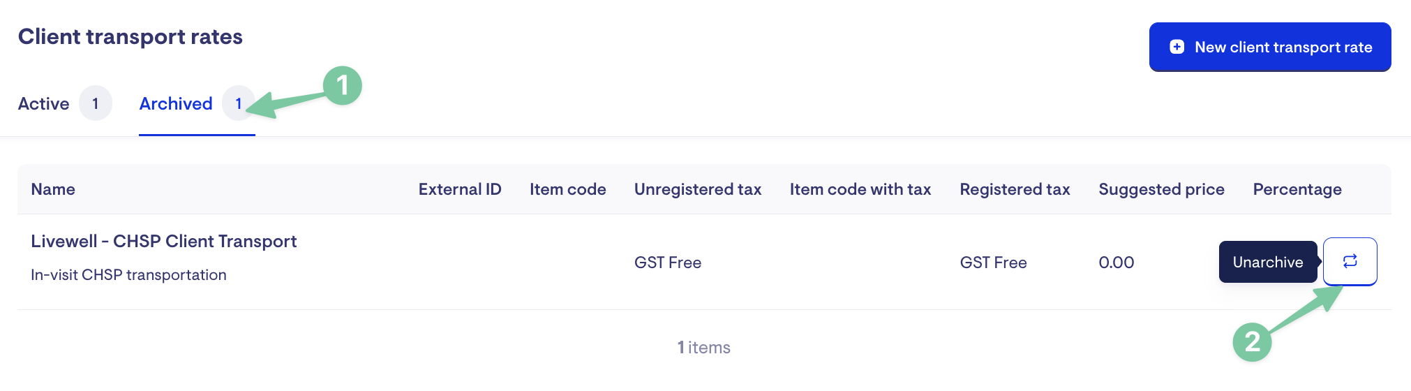 To unarchive a client transport rate, click the Archived tab > Unarchive